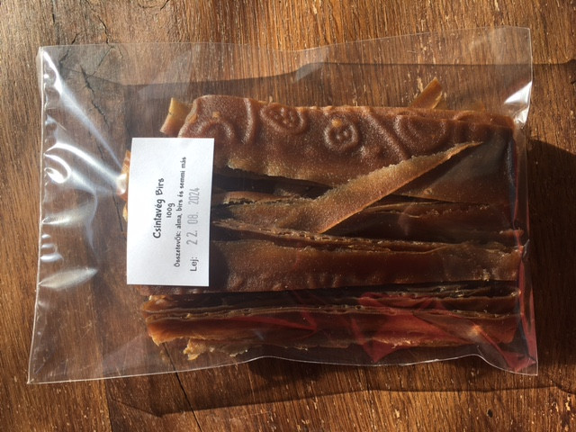 Szárított sárgabarackos gyümölcstekercs. Vegán, Gluténmentes és Nyers diétában is fogyasztható, sőt akkor is, ha az ember nem diétázik Amiből készült: sárgabarack, alma és semmi más. Hozzáadott cukrot sem tartalmaz. Fénytől védve, zárt csomagolásban tárolva sokáig finom marad. A Csinta friss, bio gyümölcsből alacsony hőfokon szárított nyers gyümölcs lap. A különleges kézműves szárítás miatt megmarad benne a gyümölcs saját íze, aromája, tápanyagai. Alapanyagok hazai, ellenőrzött bio minőségű gyümölcsök. A Csinta kíváló kiegészítője a gyermekek tízóraijának, uzsonnájának. Emellett a felnőttek is felfedezték, mint ínycsiklandó napközbeni snack-et. Megajandékozhatod vele magadat vagy másokat. Egy új lehetőség, ami színesíti a palettát a tudatos, egészséges táplálkozás terén. Használhatod különleges ételek, desszertek alapanyagaként. Lehet pl. belőle gluténmentes beiglit, gyümölcs sushit, vagy karamellizált gyümölcsbe tekert olvasztott kecskesajtot is készíteni....Hmm?