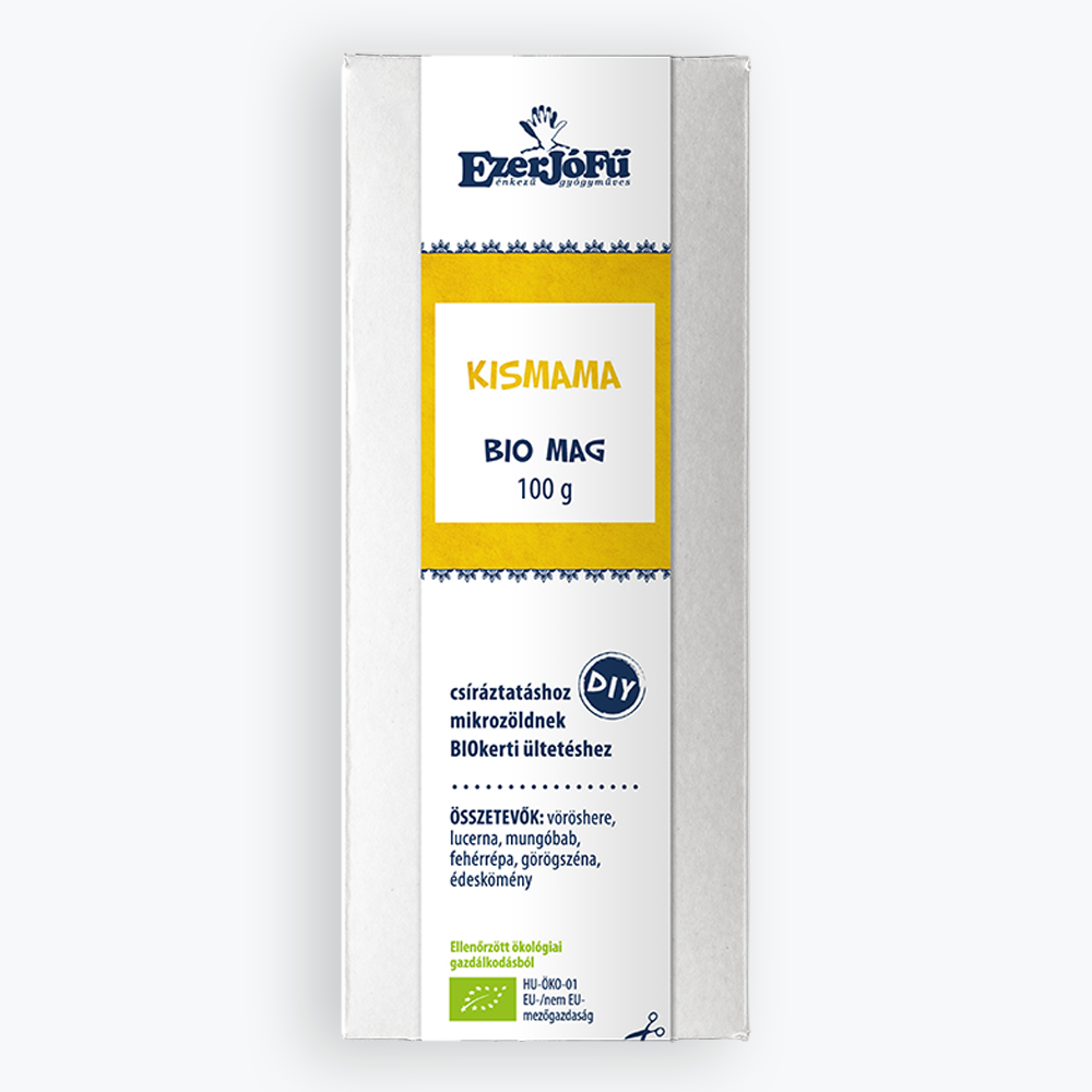 Bio magok: vöröshere, lucerna, mungóbab, fehérrépa, görögszéna, édeskömény Felhasználás: 100 g magból kb. 500 g csíra készíthető. Nettó tömeg: 100 g Tárolás: száraz, hűvös helyen közvetlen napfénytől védve tárolandó. A Bio Kismama csíramag az Ezerjófű énkezű gyógyműves bio terméke. A csírák a természet csodálatos kincsei. A kicsi magban ott rejlik a kifejlett növény, apró, de tömény ehető formában.Tiszták, frissek, tápanyagokban, vitaminokban, ásványi anyagokban, enzimekben gazdagok. A csíráztatást mi magunk is könnyedén megoldhatjuk otthon. Nem kell hozzá kert. Csupán néhány egyszerű háztartási kellék szükséges hozzá. Néhány nap alatt finom, egészséges és mindenekelőtt friss zöldhöz jutunk, amit azonnal arathatunk és fogyaszthatunk is:) A csírák fogyasztása nagyon egészséges bármely korosztály számára, hiszen az apró növények telis tele vannak ásványi anyagokkal, vitaminokkal, enzimekkel és antioxidánsokkal. Nem utolsó sorban nagyon finomak, roppanósan frissek. Figyeljünk az alapanyagokra! Kizárólag ellenőrzött forrásból származó, kiváló minőségű magokat használjunk! Csíráztatás recept: - csíráztatásra alkalmas bio csíramagok - széles szájú nagyobb dunsztosüveg - gézlap - egy erős befőttes gumi - víz Csíráztatás: 1 - Szórjuk a csíramagokat az alaposan megtisztított dunsztosüvegekbe. Fontos, hogy egy üvegbe csupán egyféle magot tegyünk. (Azért kell a nagy üveg, mert a fejlődő csíráknak szükséges lesz a hely.) 2 - A csíramagokra öntsünk tiszta, hűvös, de nem jéghideg vizet. A víz éppen lepje el a magokat. Fedjük le az üveget a gézlapokkal. 3 - Hagyjuk ázni a csíramagokat annyi időre, amíg jól megszívják magukat. 4 - Öntsük le a vizet a magokról a gézen keresztül. 5 - Állítsuk az üvegeket világos, meleg helyre. Arra ügyeljünk, hogy közvetlen napsütés ne érje őket. 6 - 12 óránként mossuk át a magokat langyos, inkább hűvös vízzel. Ennek az a célja, hogy mindig nedvesen tartsuk, de ne áztassuk szét a csíramagokat. 7 - 1-2 napon belül megjelennek az első kis hajtások. (Az öblítést mindaddig folytassuk, amíg a csíranövények el nem érik a kívánt nagyságot. Csíranövénytől és a csíráztatás külső körülményeitől függően 2-4 nap múlva, az első apró zöld levélkék megjelenésekor kivehetjük a csírákat az üvegből és megkezdhetjük a csíranövények fogyasztását. A csírák hűtőben körülbelül 1 hétig tárolhatók. Ellenőrizte: Biokontroll Hungária Nonprofit Kft. HU-ÖKÖ-01