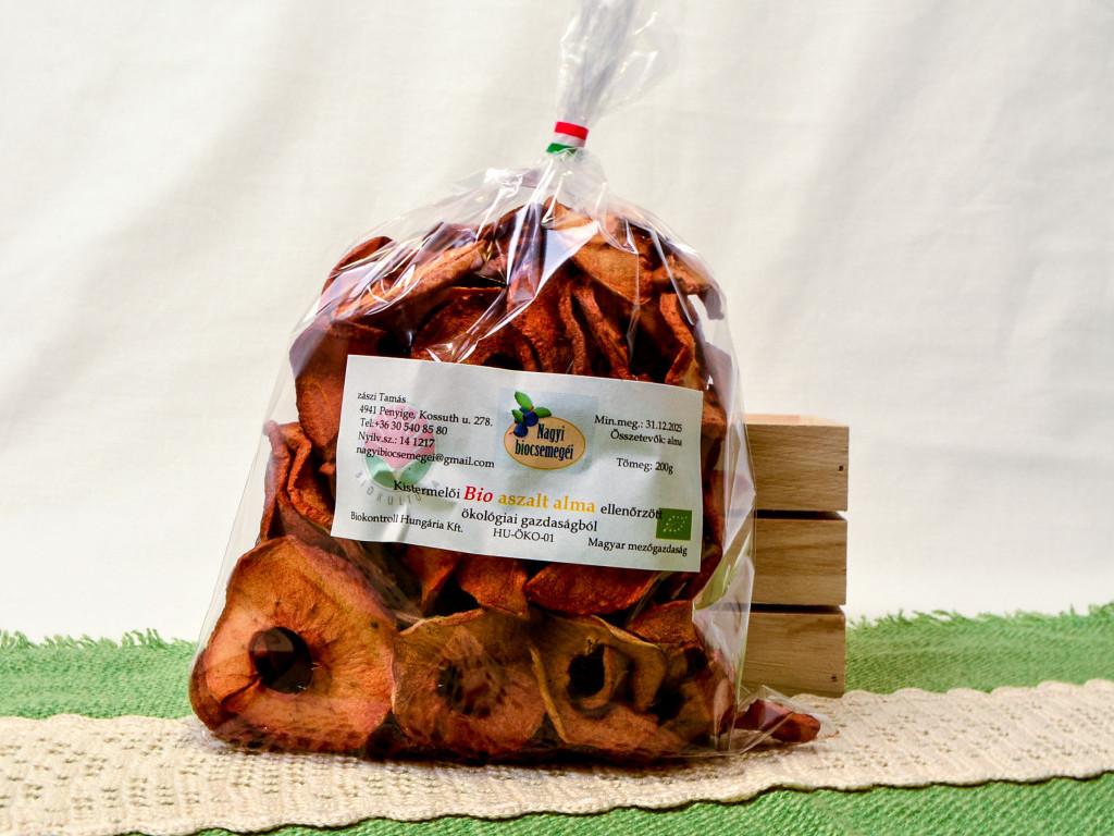 A téli hónapokban kitűnő vitaminforrás, mert aszalás után is megőrzi értékes vitaminjait. A gyerekek számára kitűnő nassolni való és édesség minden korosztálynak. Kistermelői ellenőrzött bio gazdaságban termelt bio almából készült kemencében aszalt alma karika. Termelő: Szászi Tamás- Penyige Ellenőrizte: Biokontroll Hungária Nonprofit Kft. HU-ÖKÖ-01