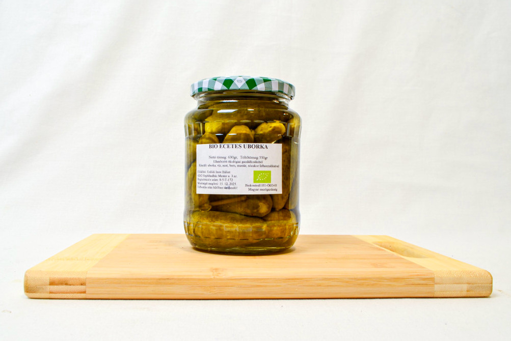 Biodinamikus termesztési móddal előállított savanyúság. Összetevők: uborka, ivóvíz, ecet, bors, mustár, só . Demeter minősített termék. Ellenőrizte: Biokontroll Hungária Nonprofit Kft. HU-ÖKÖ-01