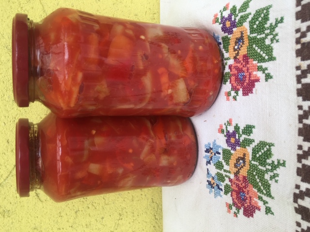 Saját termesztésű alapanyagokból készült natur lecsó. Sót, cukrot, fűszereket nem tartalmaz. Bármilyen lecsós étel alapja lehet, sózva, fűszerezve tojással vagy rizzsel elkészítve kiváló egytálétel. Elsőnek sűrű paradicsomlevet főztem. A hagyma, majd a darabolt étkezési paprika került a fazékba, rövid főzési idő után öntöttem fel a paradicsomlével. Kevés na-benzoátot kapott és szárazdunsztba került.