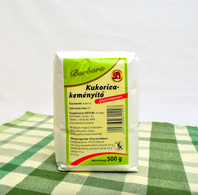 Barbara gluténmentes termékcsalád:Kukoricakeményítő Összetevők: kukorica Átlagos tápérték 100 g termékben: Energiatartalom:1470 kJ/346kcal, Zsír:0,0g, amelyből telített zsírsavak:0,0g, Szénhidrát:86,0g, amelyből cukrok:0,0g, Fehérje:0,5g, Só:0,0g Gyártó:Diéta Bt