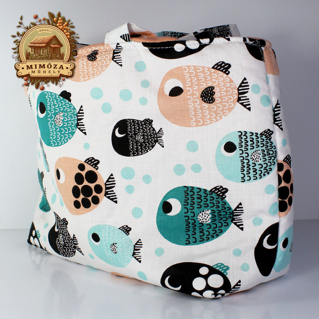 Uzsonnás táska halacskás mintával – halvány barackvirág béléssel Ha egy lágyabb, melegebb árnyalatot keresel, ez a táska a tökéletes választás. A barackvirág bélés meghittséget sugároz, mint egy déli fényben pompázó virág. Ugyanaz a gondosan bélelt, zsinóros kialakítás, ami megkönnyíti a tisztán tartást és a használatot, csak egy másik érzelmi hangulatba öltöztetve. Egy gyermek napja tele van felfedezéssel, mozgással és játékos kalandokkal – ehhez pedig szükség van egy megbízható, szerethető társra, amiben minden finomság biztonságban megérkezik. Ez a kézműves, bélelt uzsonnás táska nem csak praktikus, de vidám halacskás mintájával és halvány barackvirág bélésével igazi örömet szerez kicsiknek és nagyoknak. Miért imádják a gyerekek? – Könnyen kezelhető – a zsinóros zárásnak köszönhetően a legkisebbek is önállóan tudják nyitni-zárni. – Puha, mégis tartós – a vatelin réteg megvédi az uzsonnát a nyomódástól. – Vidám minta – a halacskák minden nap mosolyt csalnak az arcokra. Szülőknek is jó döntés – Biztonságos és higiénikus – a pamut bélés könnyen tisztán tartható. – Környezetbarát – újra és újra használható, kiváltja az egyszer használatos zacskókat. – Sokoldalú – nem csak oviba vagy suliba, hanem munkahelyre, piknikre is tökéletes ebédhordó táska. Kiváló ajándékötlet Ez a táska tökéletes választás: – óvodakezdésre vagy iskolakezdésre – születésnapra, névnapra – karácsonyi meglepetésként – „csak úgy”, hogy örömet szerezzünk Méretek: 24 cm széles, 19 + 8 cm magas, 10 cm mély Anyagösszetétel: – Külső: színes gyerekmintás pamutvászon – Belső: halvány barackvirág színű pamutvászon – Középső réteg: vatelin – Pánt: pamutvászon, saját anyagból – Záródás: zsinóros A termék színe a valóságban kismértékben eltérő lehet a képen láthatóhoz.