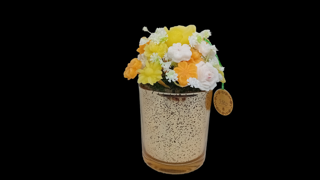 Gyertya virágbox ,sárga üvegkaspóban. A virágok viaszból készültek ,sárga, narancs és fehér szinekben. A csokor tartalmaz még ,tűzőhabot , tartósított mohát. és kb 20db viasz virágot A tömörítést apró mesterséges gypsophilával oldottam meg. Szépségét sokáig élvezhetjük, nem hervad el. Szeretettel ajánlom ajándéknak ,vagy saját magunknak.