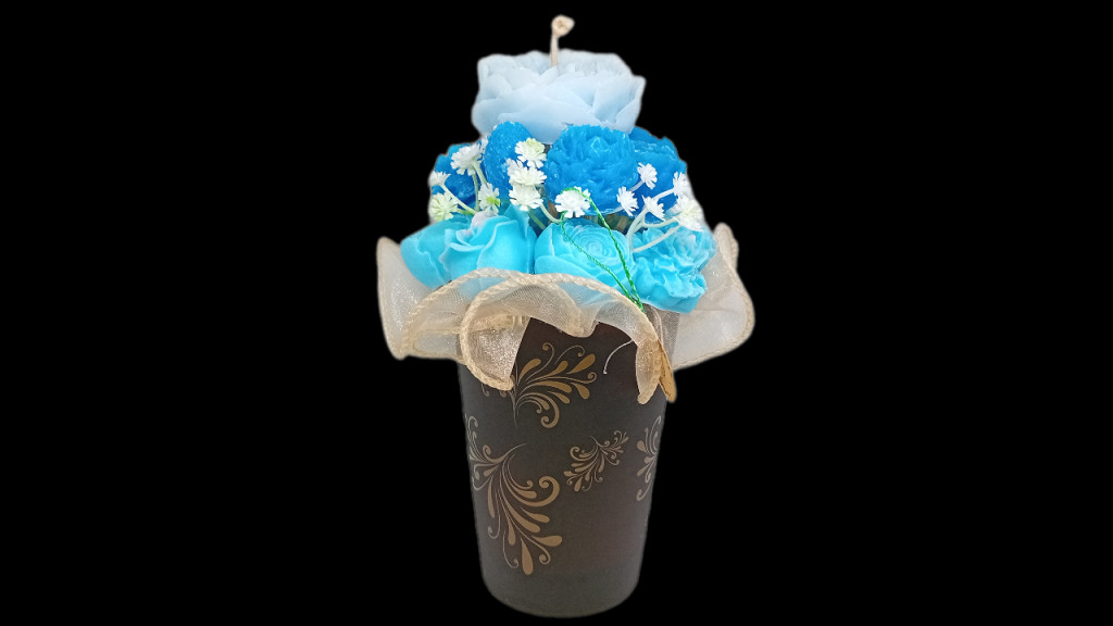 Gyertya virágbox, kék színű kaspóban. A virágcsokor készítéséhez felhasznált anyagok:világos kék,közép kék, sötétebb kék színű viaszból készült virágok,tüzőhab,szárított virágok ,kék kerámia kaspó.19db virágot tartalmaz. Szépségét sokáig élvezhetjük,nem hervad el. Asztali dísz gyertya,meggyújtásra nem alkalmas. Szeretettel ajánlom ajándéknak ,vagy saját magunknak. Köszönöm