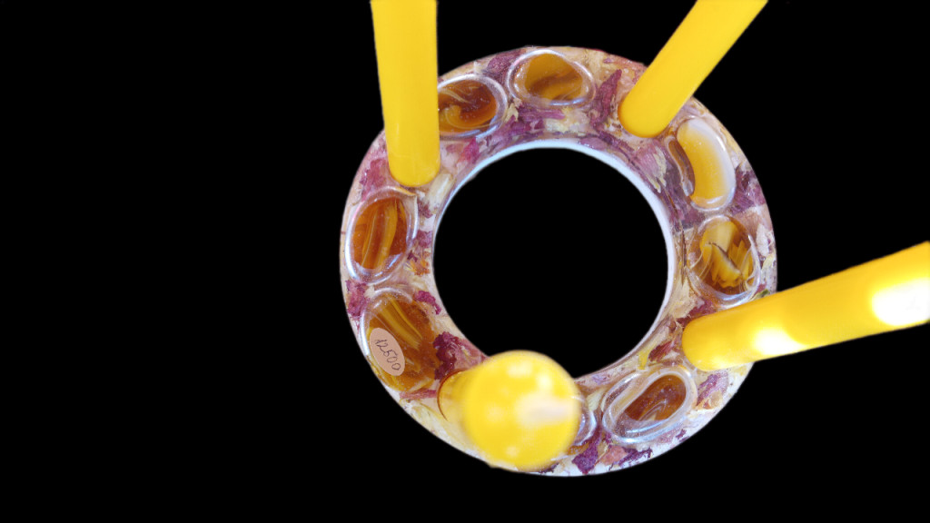 A gyertyák méhviaszból készültek . A tartó Jesmonite ásványi porból, és Epoxi átlátszó gyantából ,készült, kövekkel , bogyókkal díszítve