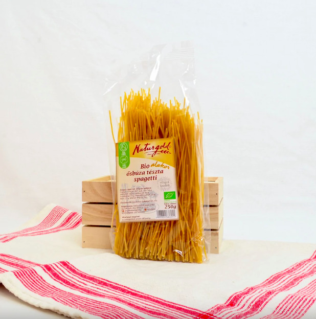 Vékony hosszú tésztaszálak, manufaktúrálisan, kézzel készült különlegesség. Finom, minőségi, magyar. Az egyik legnépszerűbb levestészta a magyar háziasszonyok között!m Főzési idő: 3-5 perc, Tojásmentes tészta. Nettó tömeg : 250 g Forgalmazó: Naturgold Hungária Kft. Összetevők: frissen őrölt bio tönkölyliszt, víz Átlagos tápérték / 100 gEnergia : 1503 kJ / 355 kcal Zsír : 1,6 g amelyből telített zsírsavak : 0,3 g Szénhidrát : 71 g amelyből cukor : 2,2 g Élelmi rost : 3 g Fehérje : 13 g Só : 0 g A termék a nátrium természetes jelenlétéből adódóan tartalmaz sót. Ellenőrizte: Biokontroll Hungária Nonprofit Kft. HU-ÖKÖ-01