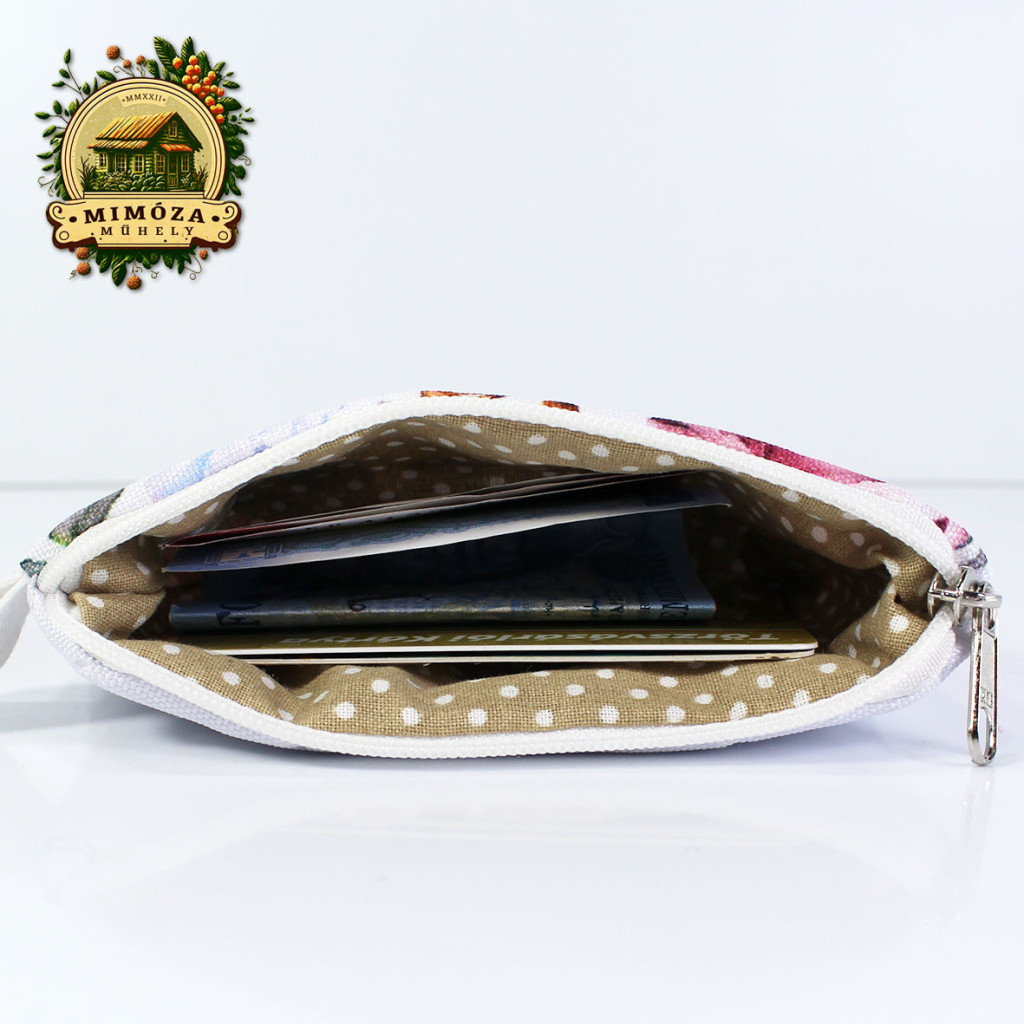 Kívül strapabíró gyöngyvászon, belül puha pamutvászon, középen vatelin gondoskodik róla, hogy a kártyáid védve legyenek.