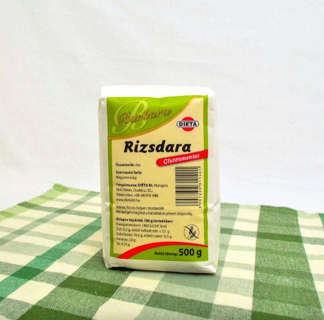 Barbara gluténmentes RIZSDARA A gluténmentes rizsdara helyettesítheti gluténérzékenyek számára is a búzadarát. Fogyaszthatjuk tejbegrízként vagy készíthetünk belőle krémeket süteményekbe pl. mézes krémesbe. A hagyományos búzadara helyett főleg két alapanyag közül választhatnak a lisztérzékenyek: rizsdara vagy kukoricadara. A kukoricadara jobban elterjedt, az ára is kedvező, azonban sok gluténérzékeny beteg nem fogyasztja szívesen jellegzetes kukoricaíze miatt. Számukra lehet jó választás a rizsdara, mely gluténmentes alapanyag, és kiválóan helyettesíti a hagyományos búzadarát. A rizsdara készítése során a rizsszemeket apró szemcsékké őrlik, így az értékes összetevők nem vesznek el, az íze is a megszokottal teljesen megegyező. Jól használható tejbegríz, grízes tészta, túrógombóc, esetleg sütemények készítéséhez. Összetevők: rizs Származási hely: Magyarország Átlagos tápérték 100 g termékben: Energia/100g: 1450 KJ/341kcal zsír:0,2 g, ebből telített zsír: