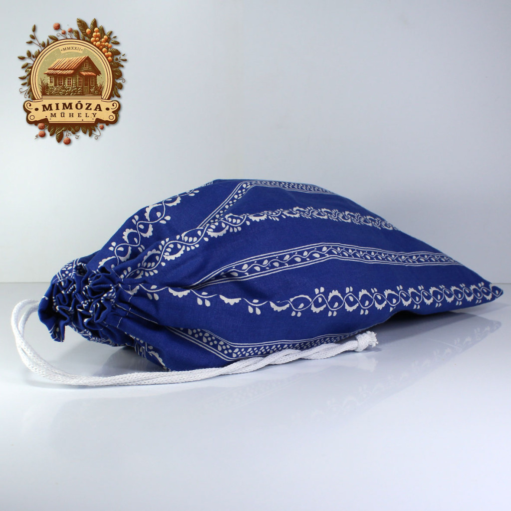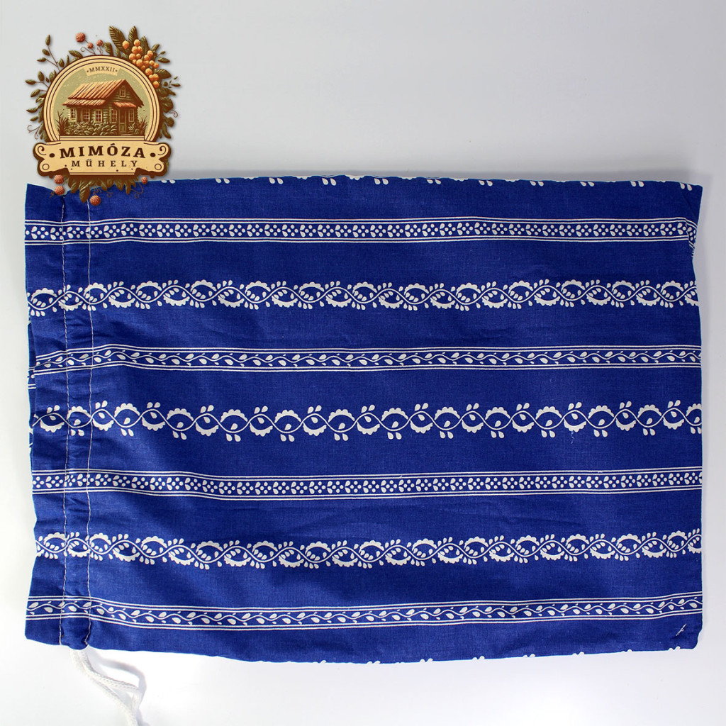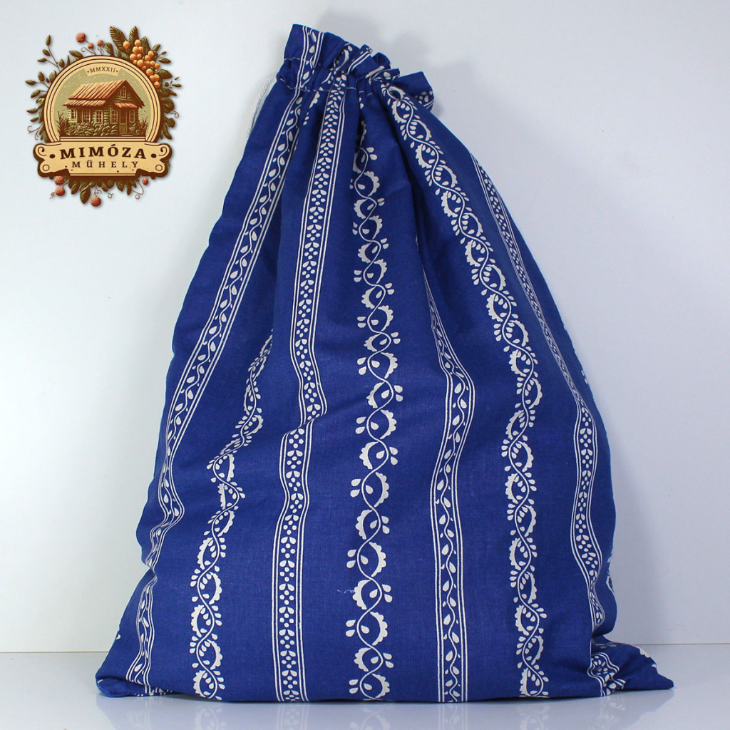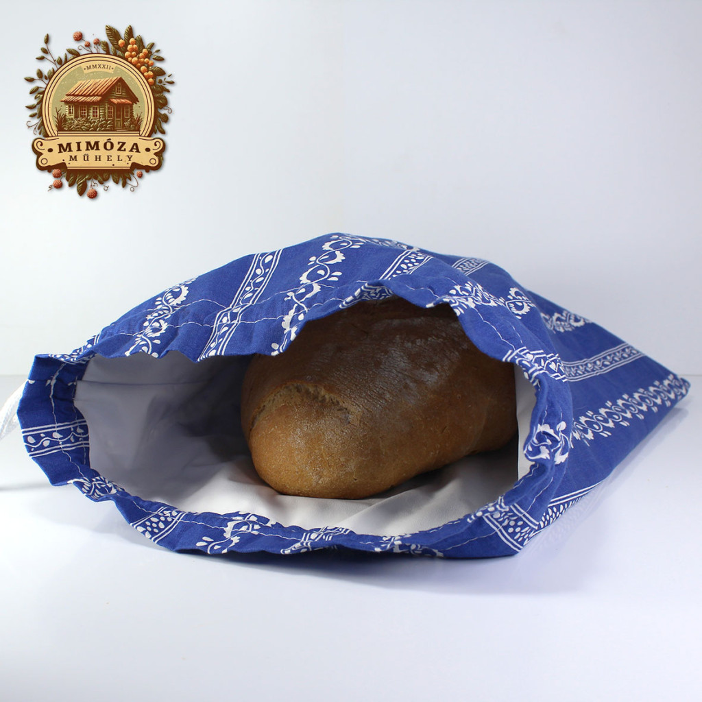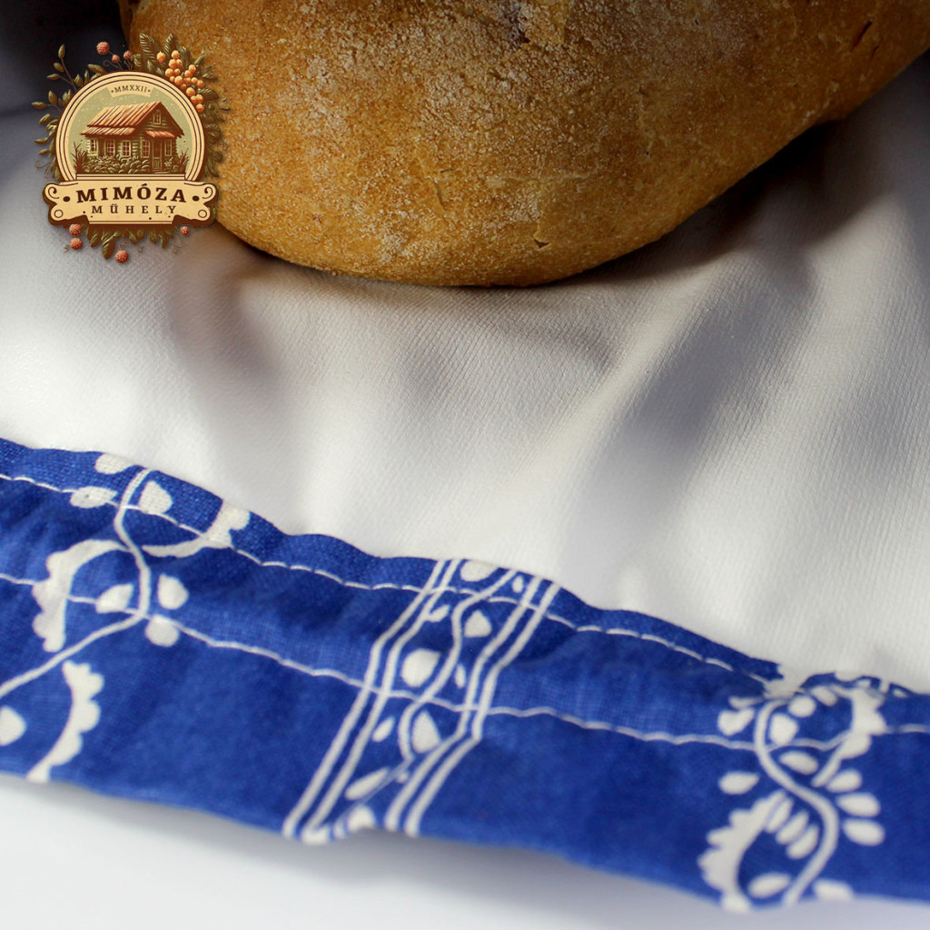 Ez a kenyeres zsák kék színben, népies mintával ötvözi a hagyományos kenyértárolás időtálló praktikáját a modern otthon természetes szépségével.