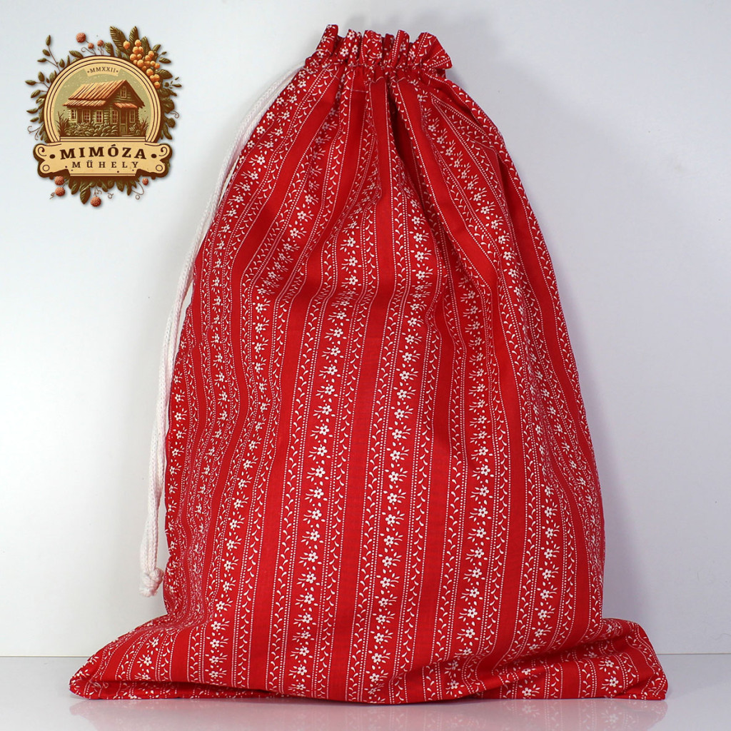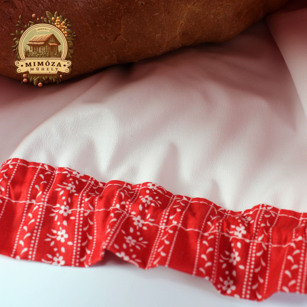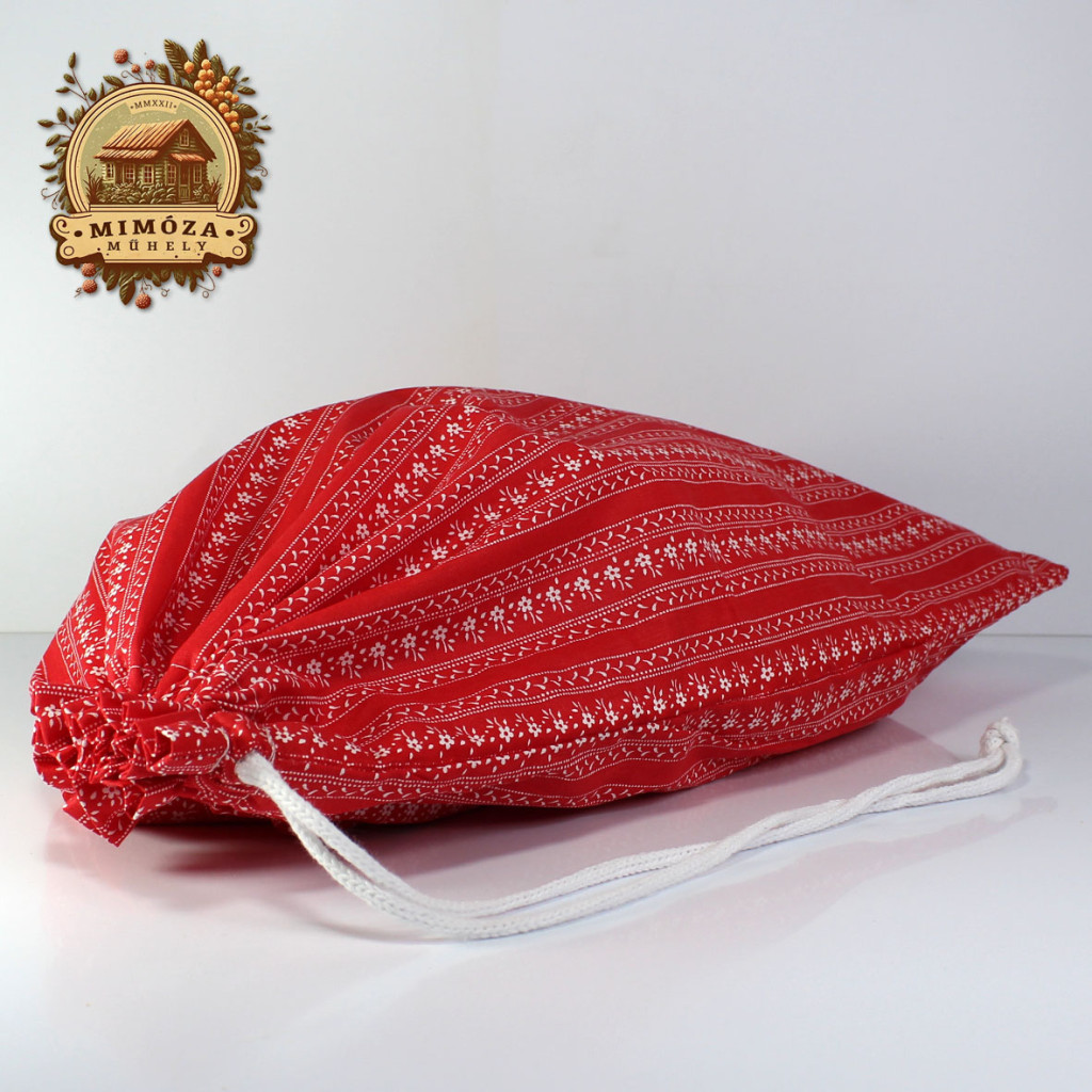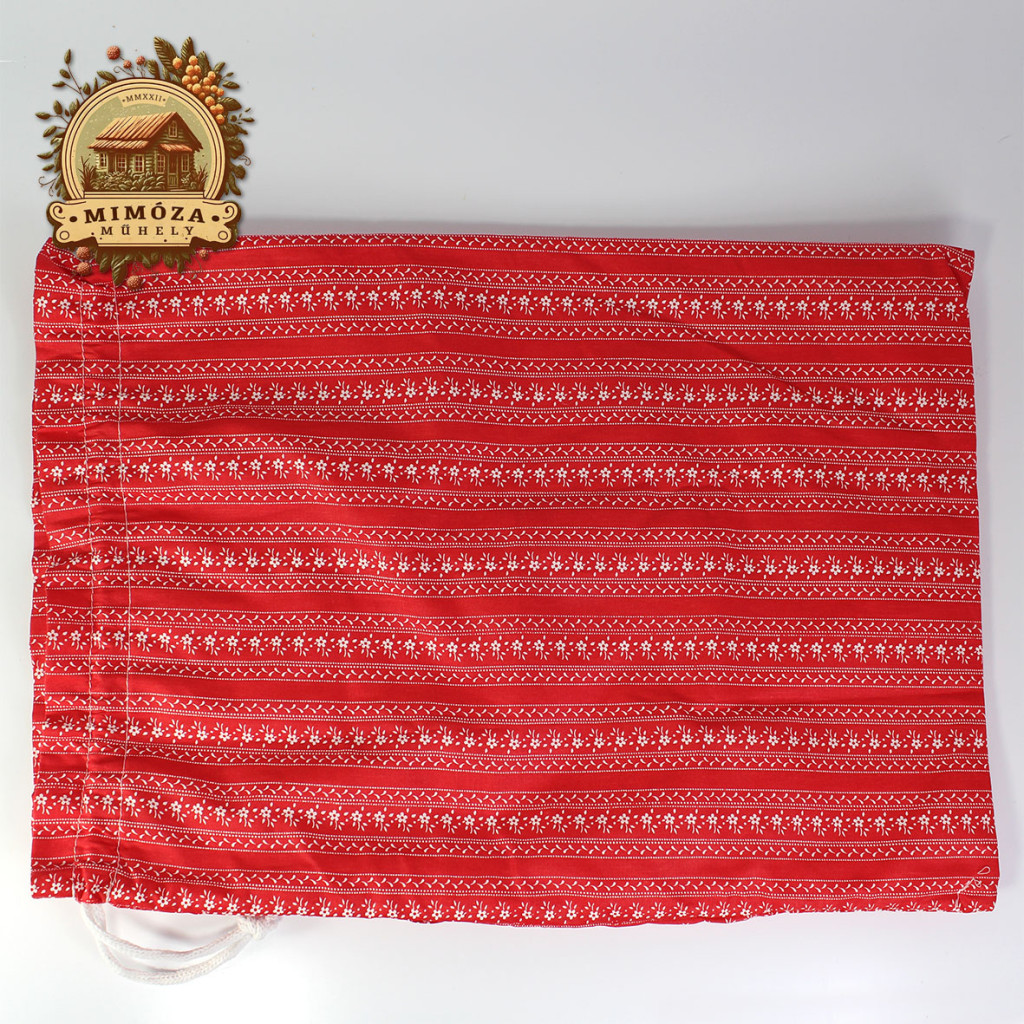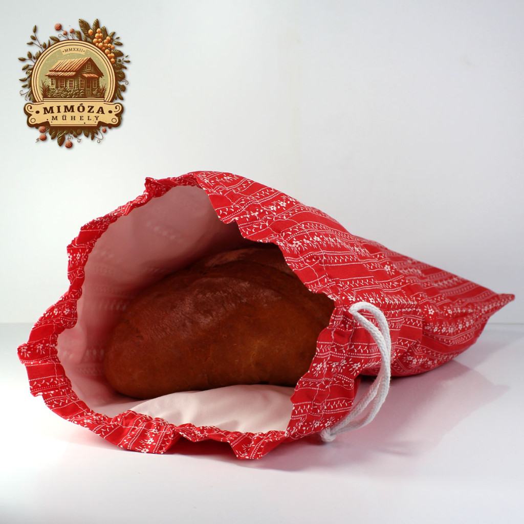 Ez a piros, népies mintás kenyeres zsák a régi idők kenyértartási szokásait idézi, miközben megfelel a mai kor higiéniai és környezettudatos elvárásainak.