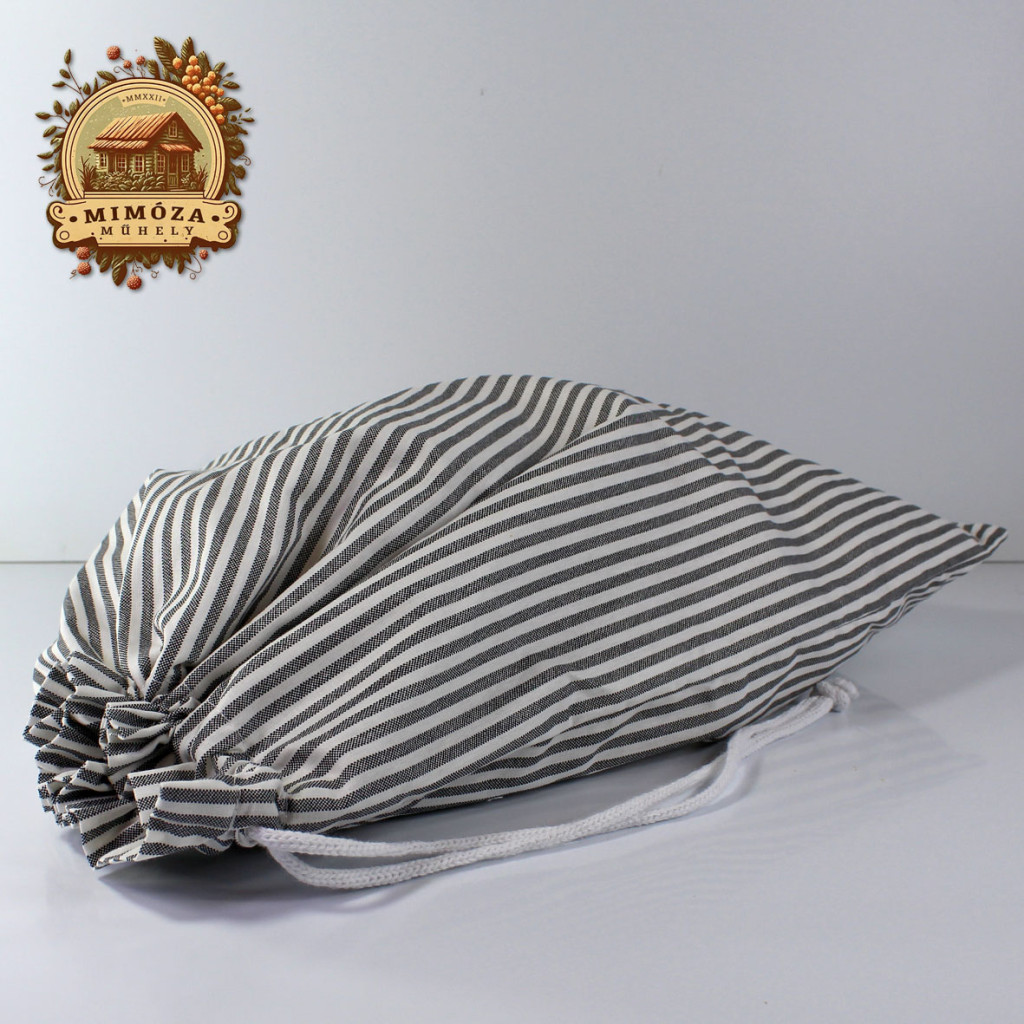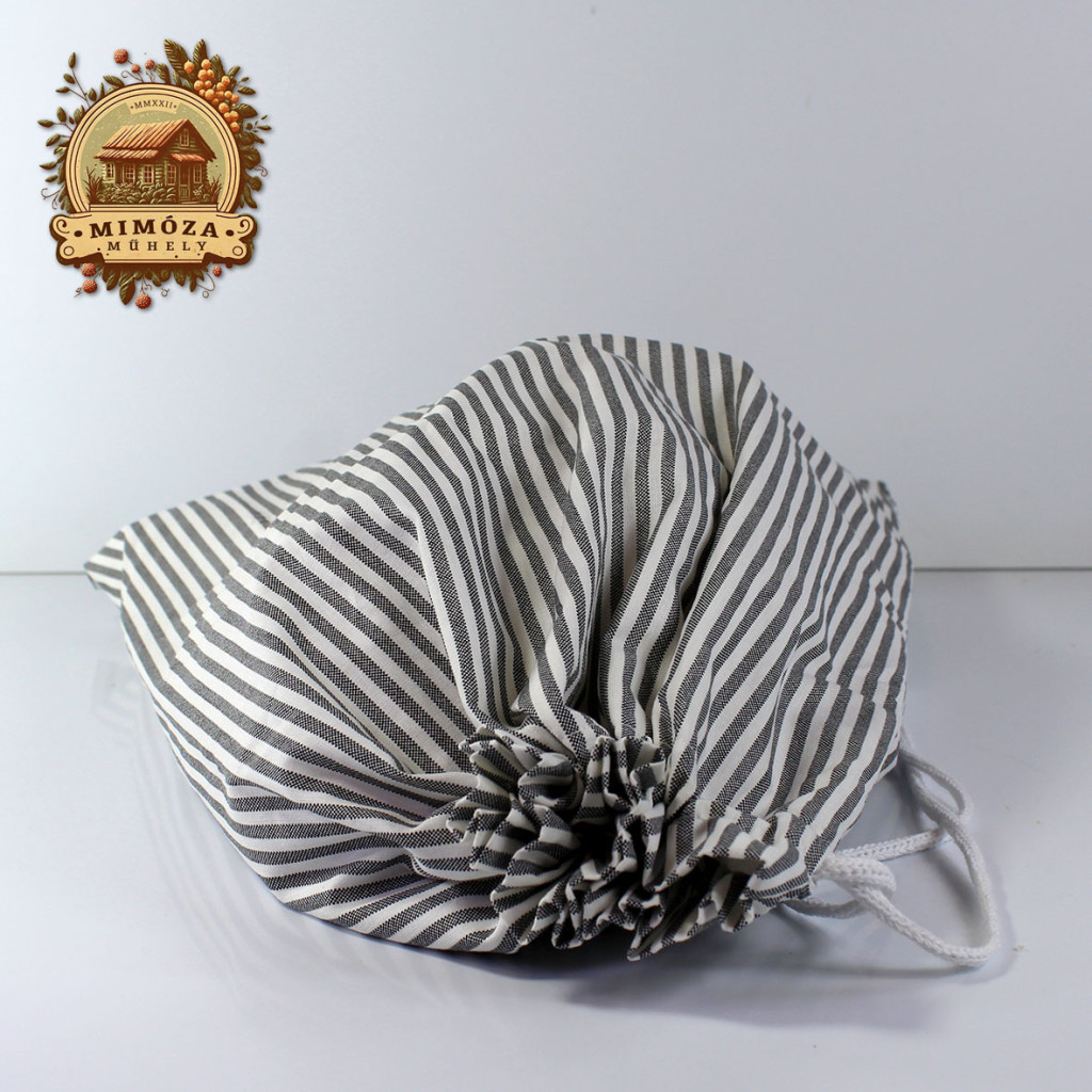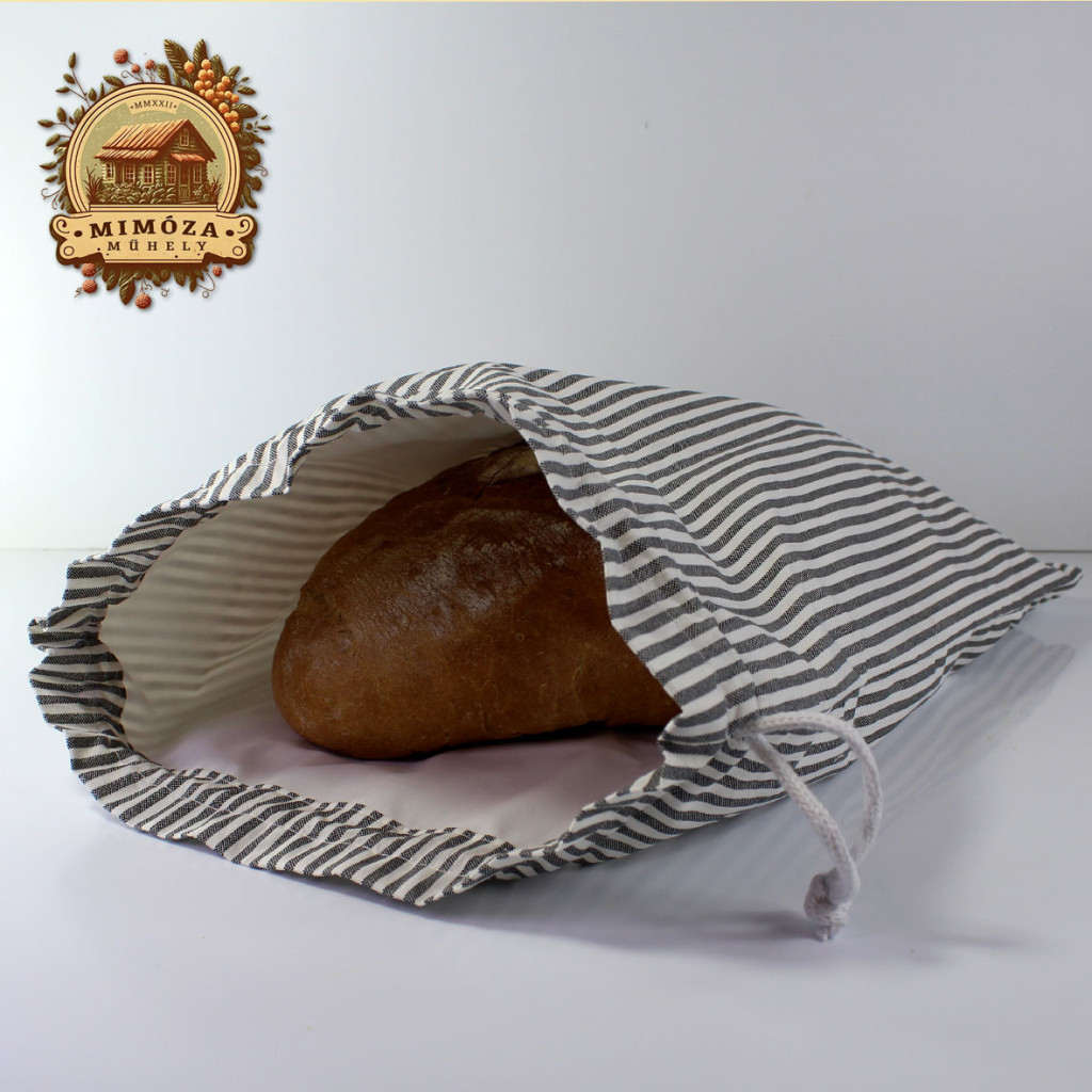 Ez a szürke-fehér csíkos kenyeres zsák nemcsak esztétikus, hanem praktikus is – a hagyományos kenyértárolás modern változata, amely megkönnyíti a mindennapokat.