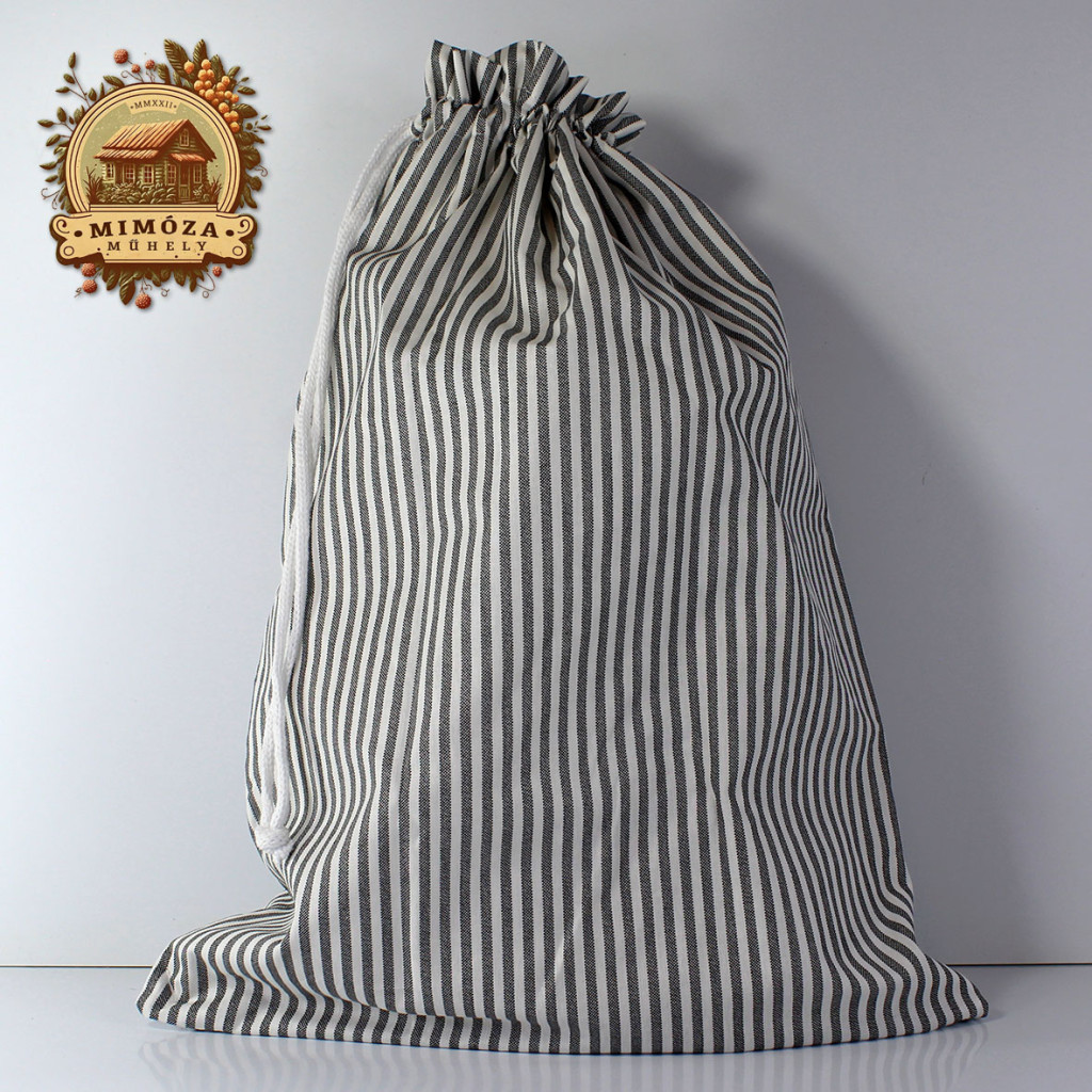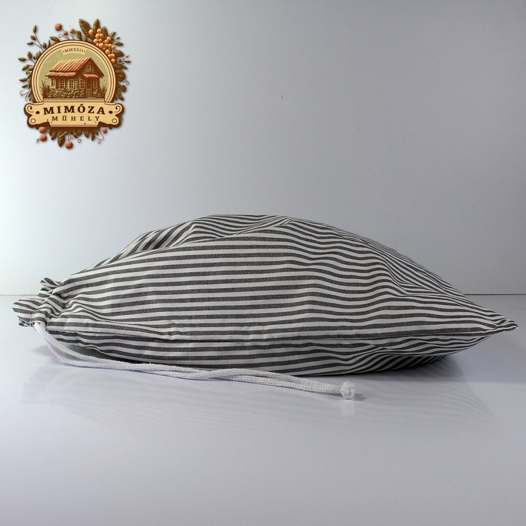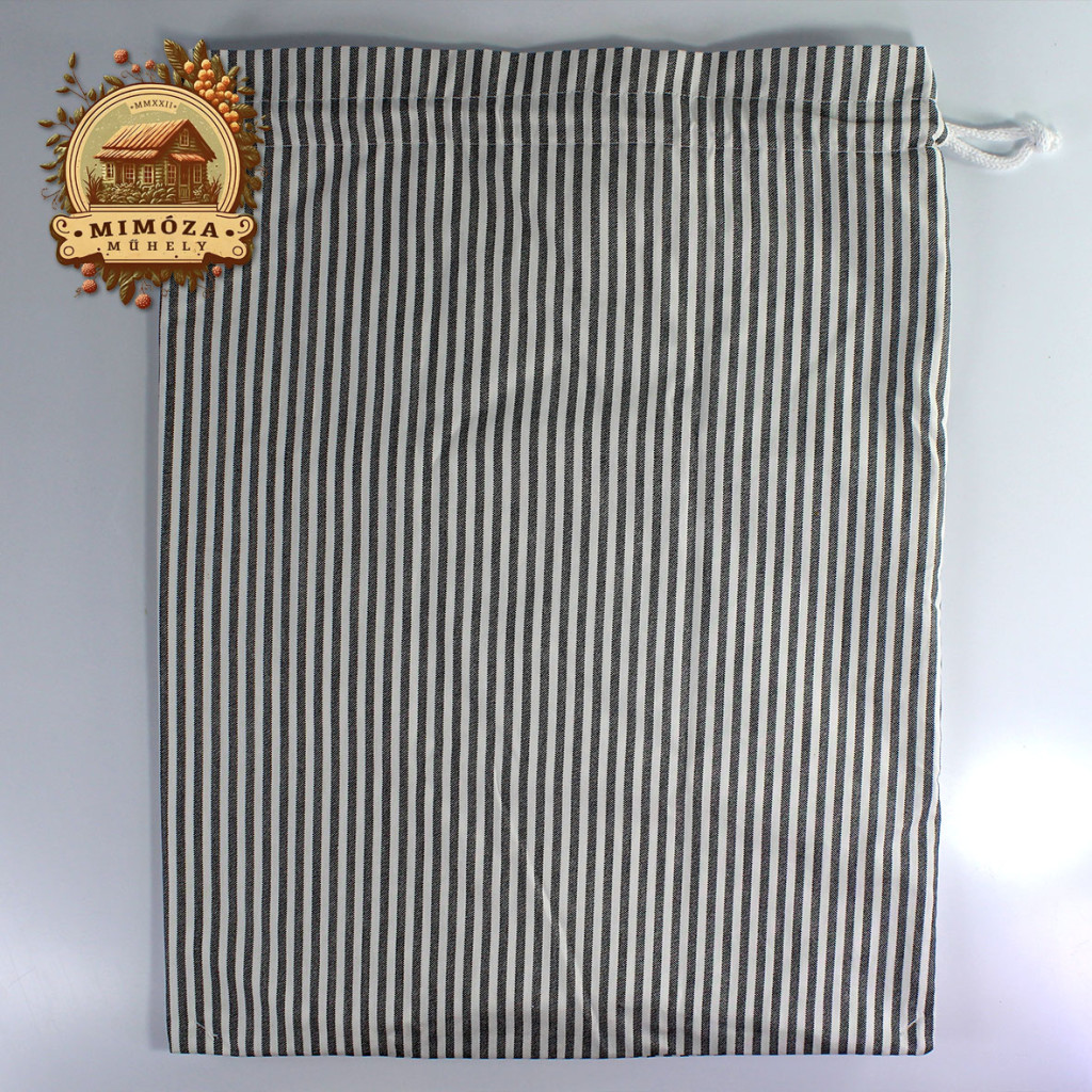 Ez a szürke-fehér csíkos kenyeres zsák nemcsak esztétikus, hanem praktikus is – a hagyományos kenyértárolás modern változata, amely megkönnyíti a mindennapokat.
