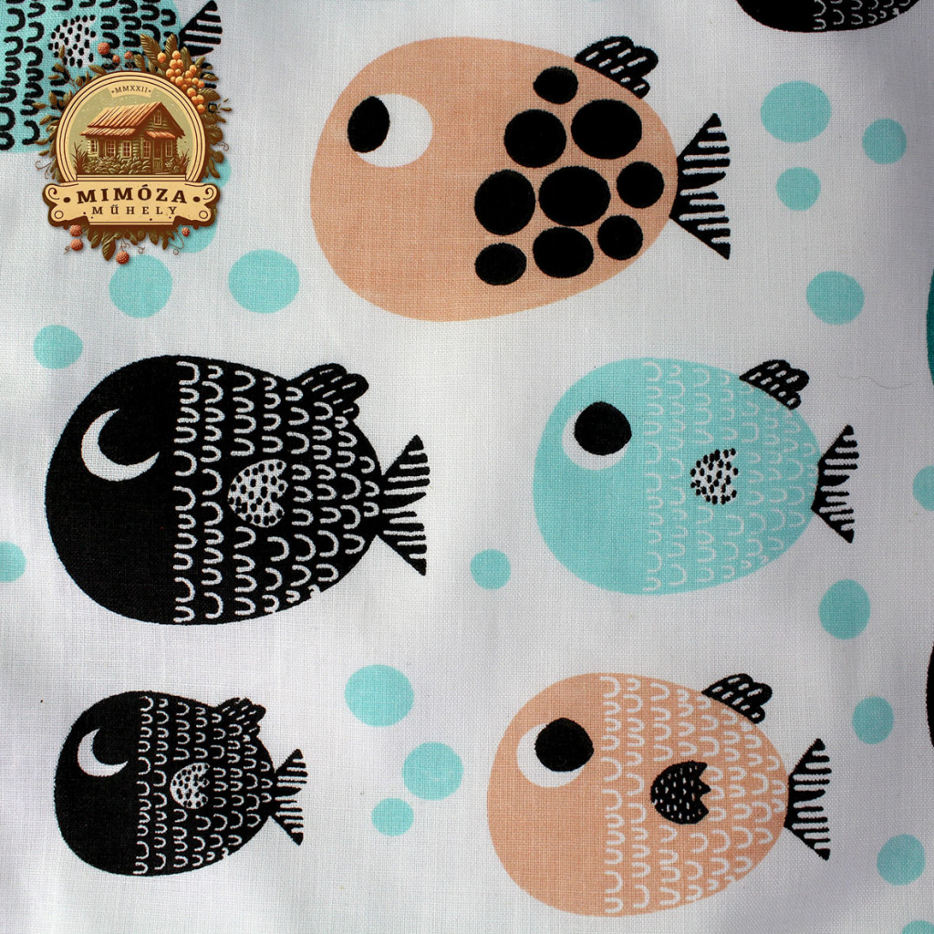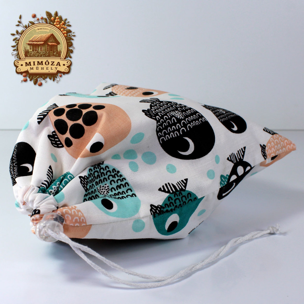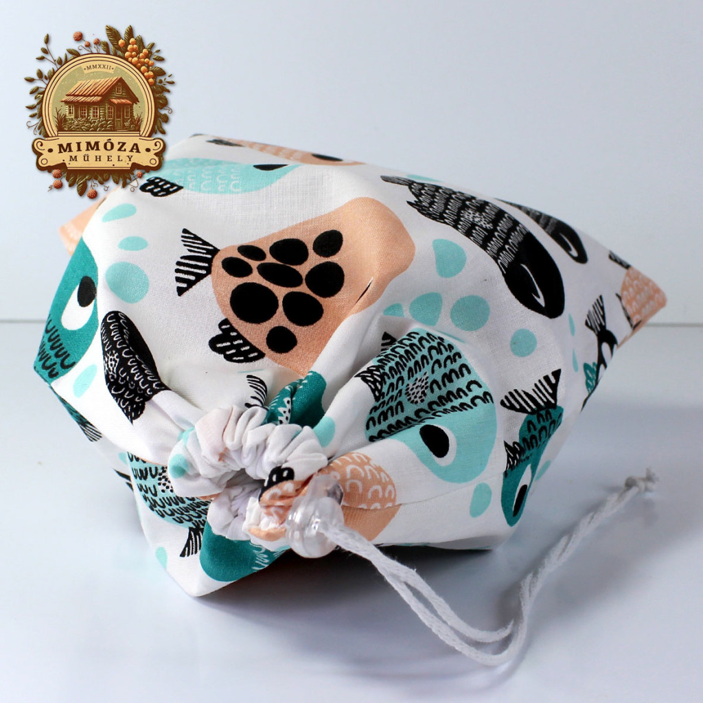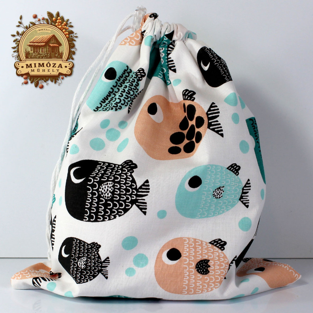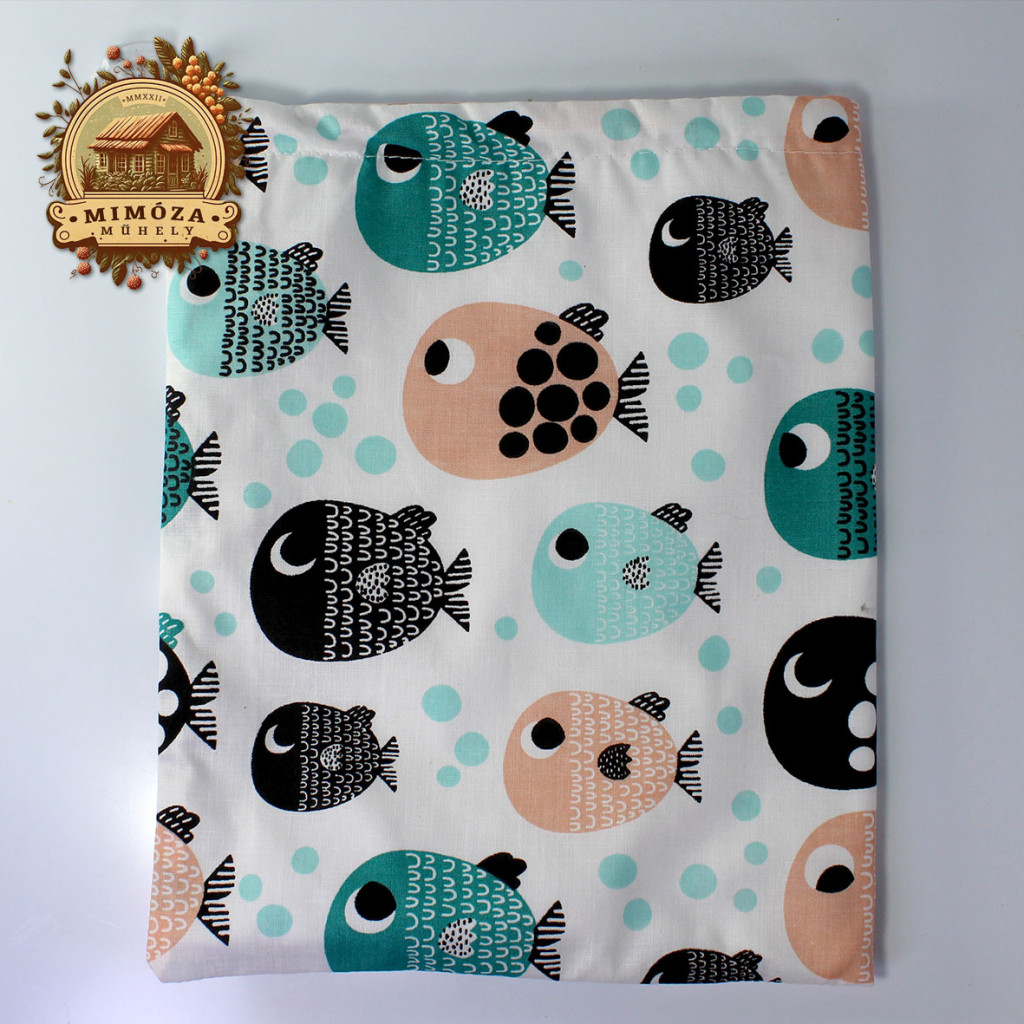 Kívül vidám halacskás mintás pamutvászon, belül pedig lélegző, PUL bélés, hogy a zsemléd, kiflid friss maradjon akár egész nap.