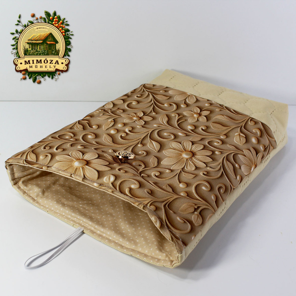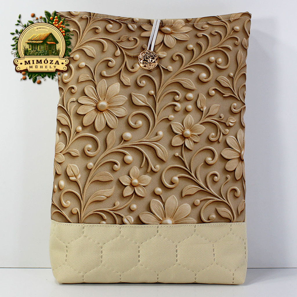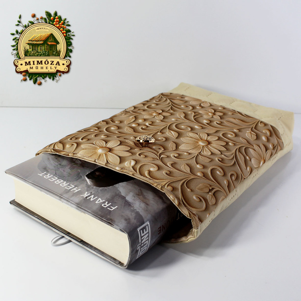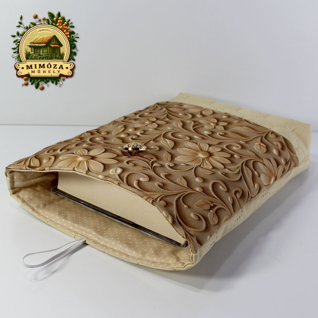 Könyv- és tablettartó tok – bézs színben, 3D-s virág mintával