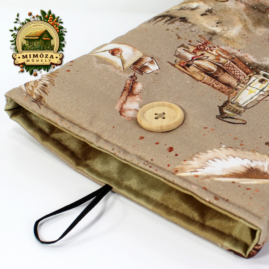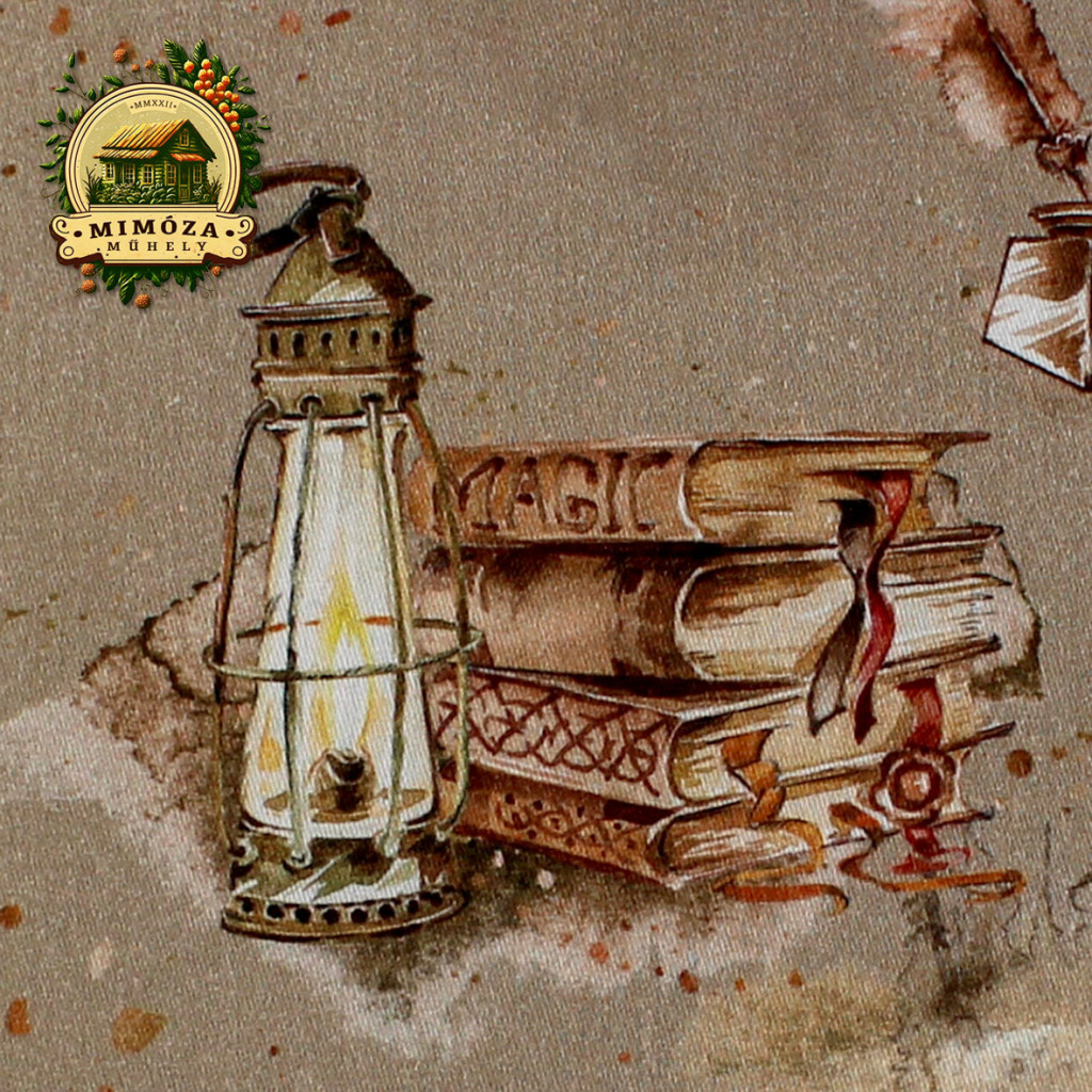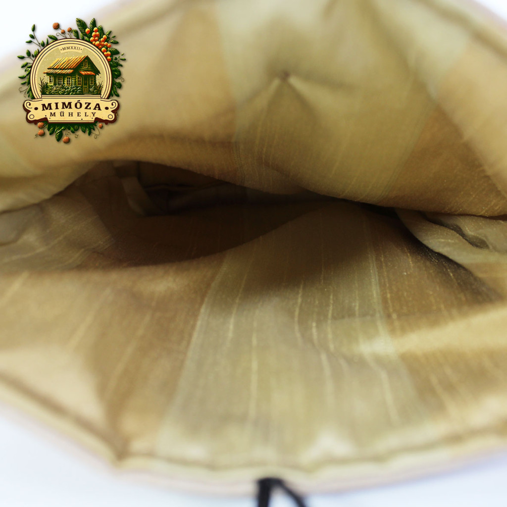A külső rész pamutvászon, a belső aranyszínű bélés pedig diszkréten elegáns. Amikor kinyitod, egy pillanatra olyan érzés, mintha egy régi varázslókönyvet tárnál fel.
