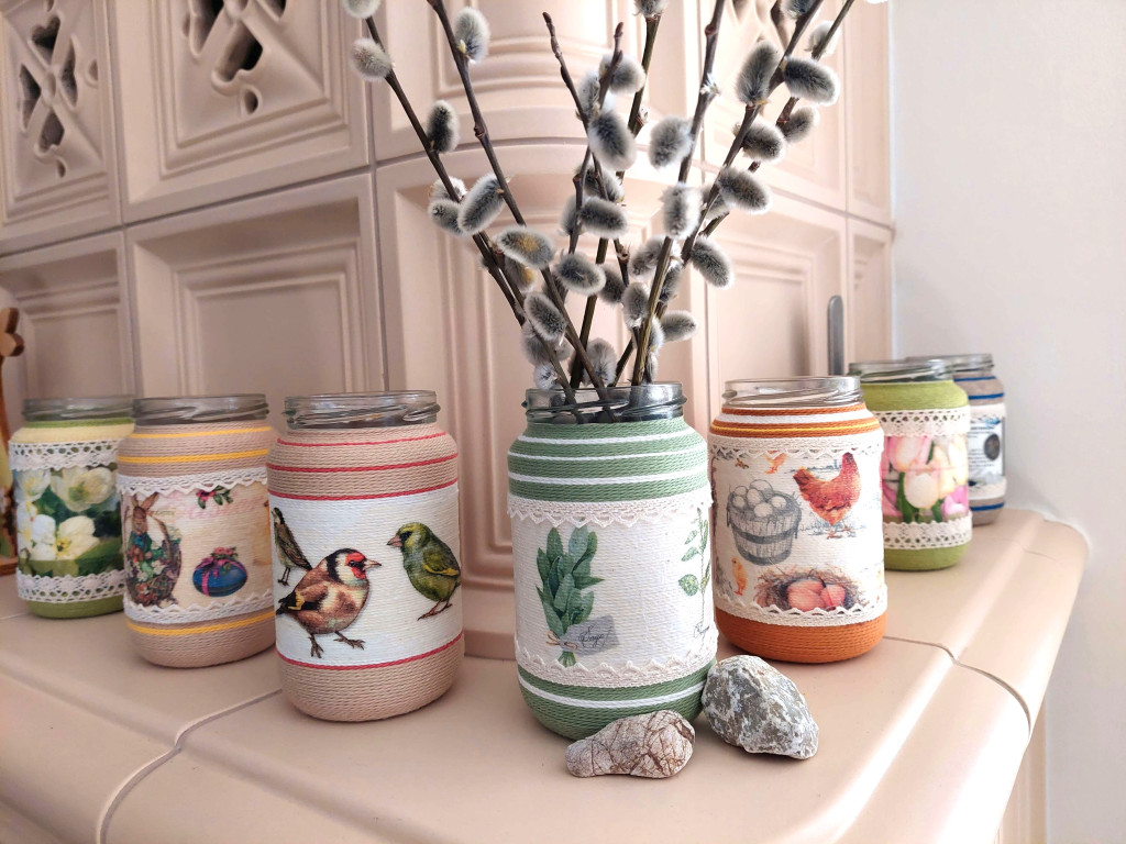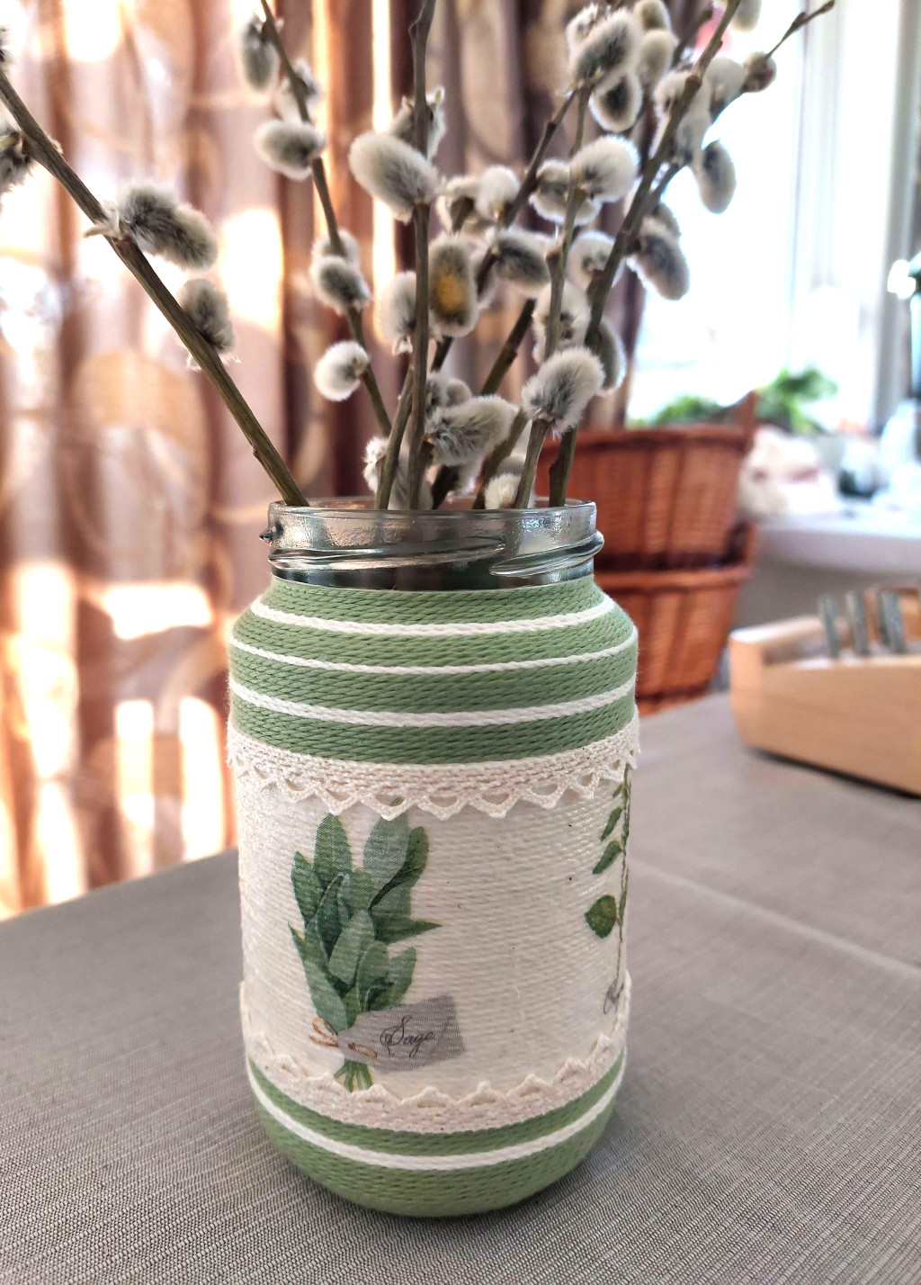 Újrahasznosított 370 ml-es üveget tekertem körbe lenzsinórral, szalvétával dekopázsoltam, csipkével díszítettem. Egyedi kézműves termék, alkalmas vázának, tolltartónak.