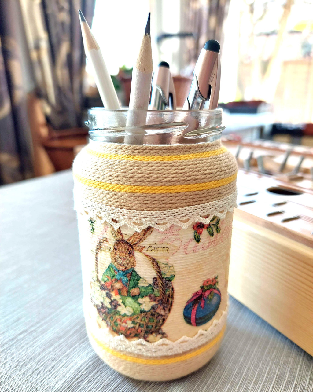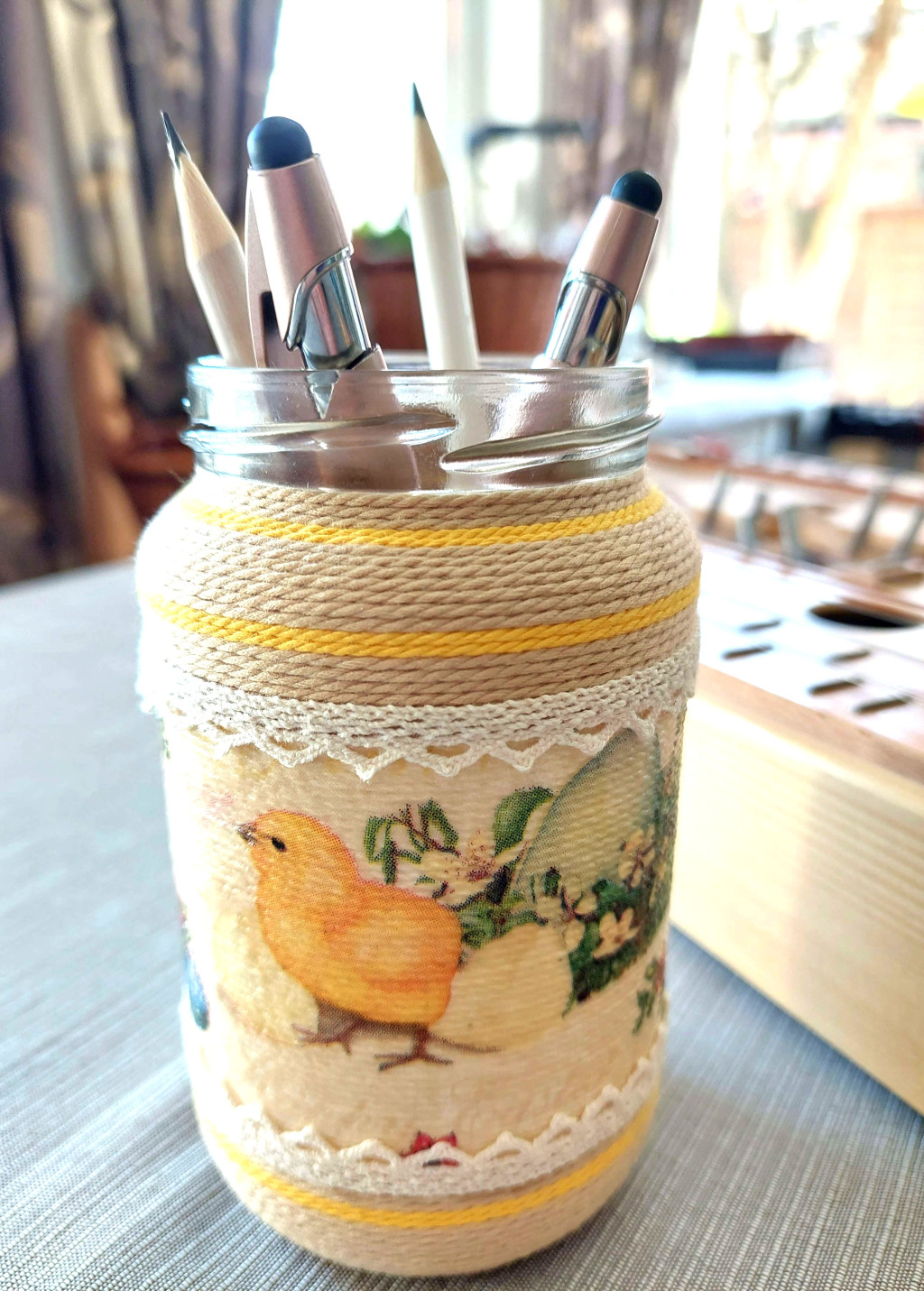 Újrahasznosított 370 ml-es üveget tekertem körbe lenzsinórral, szalvétával dekopázsoltam, csipkével díszítettem. Egyedi kézműves termék, alkalmas vázának, tolltartónak.