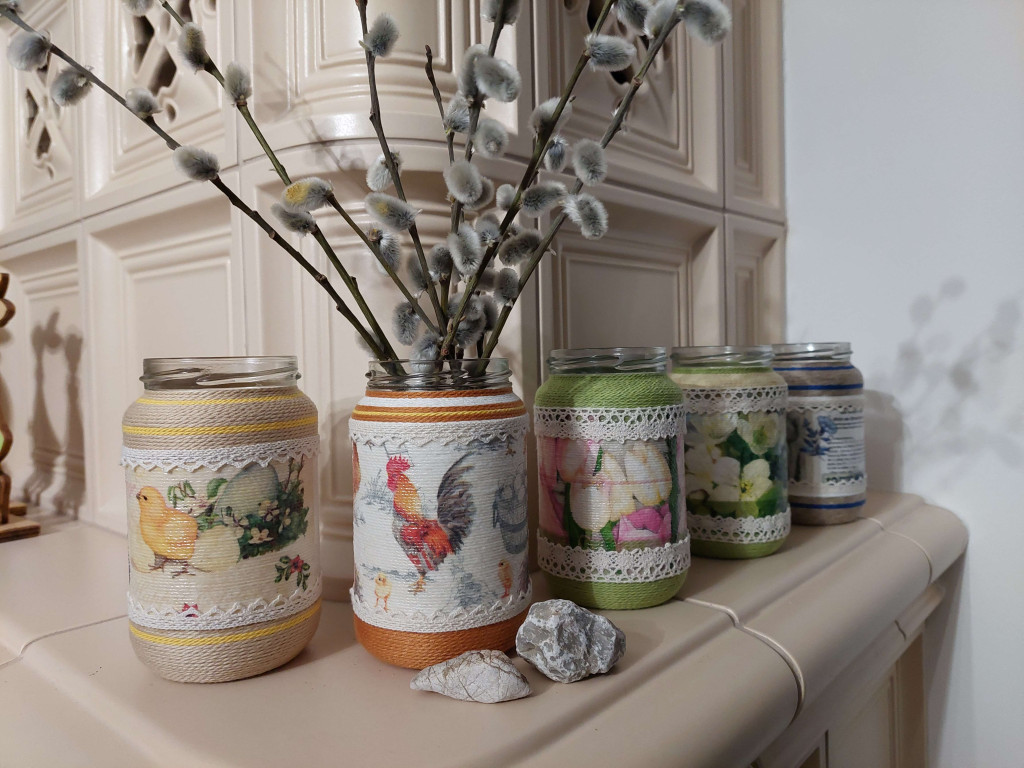Újrahasznosított 370 ml-es üveget tekertem körbe lenzsinórral, szalvétával dekopázsoltam, csipkével díszítettem. Egyedi kézműves termék, alkalmas vázának, asztali tolltartónak.