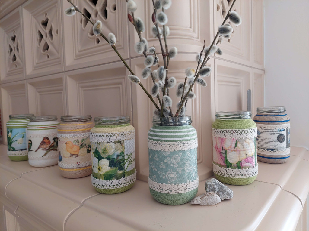 Újrahasznosított 370 ml-es üveget tekertem körbe lenzsinórral, szalvétával dekopázsoltam, csipkével díszítettem. Egyedi kézműves termék, alkalmas vázának, tolltartónak.