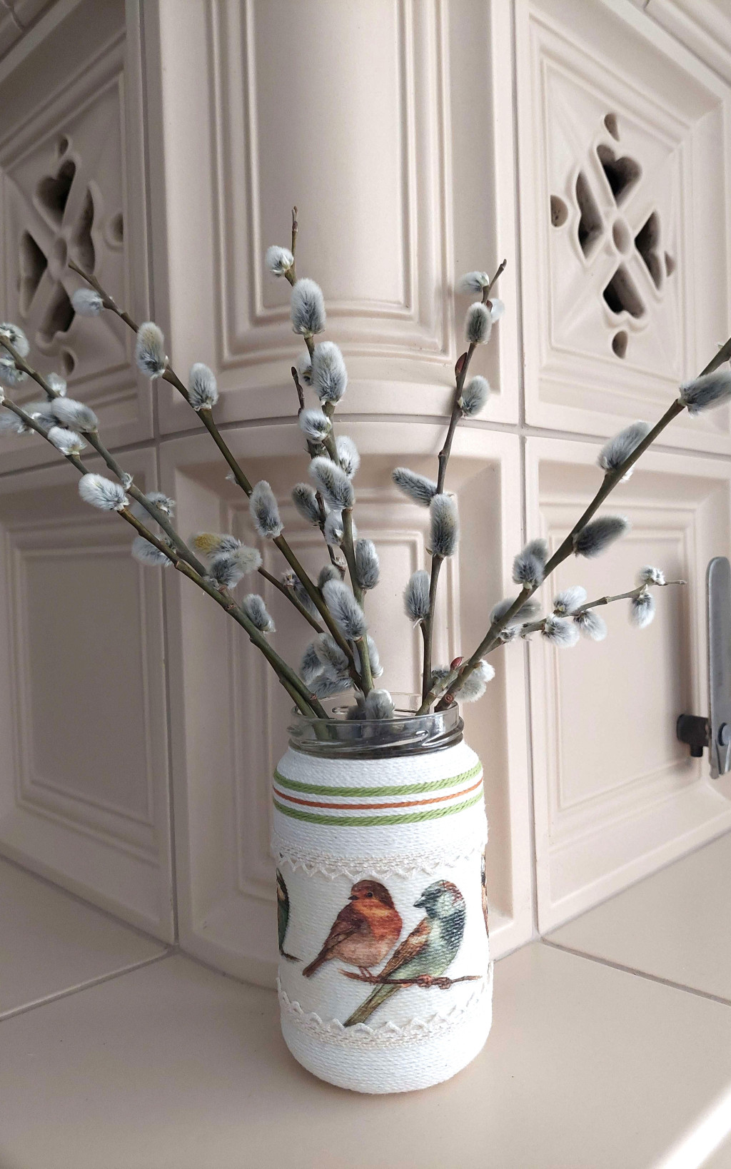 Újrahasznosított 370 ml-es üveget tekertem körbe lenzsinórral, szalvétával dekopázsoltam, csipkével díszítettem. Egyedi kézműves termék, alkalmas vázának, tolltartónak.