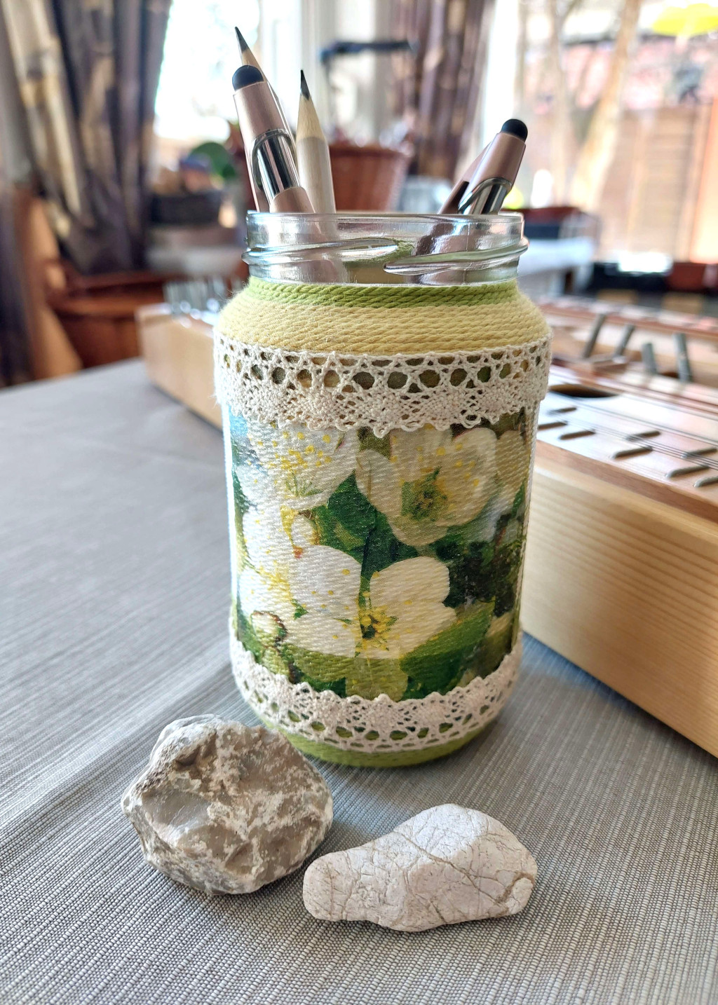Újrahasznosított 370 ml-es üveget tekertem körbe lenzsinórral, szalvétával dekopázsoltam, csipkével díszítettem. Egyedi kézműves termék, alkalmas vázának, tolltartónak.