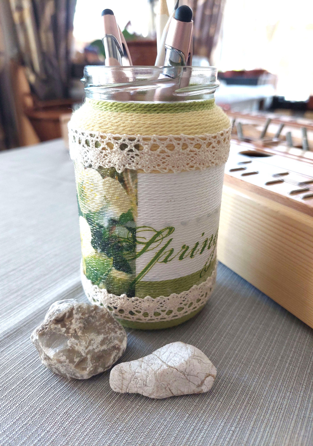 Újrahasznosított 370 ml-es üveget tekertem körbe lenzsinórral, szalvétával dekopázsoltam, csipkével díszítettem. Egyedi kézműves termék, alkalmas vázának, tolltartónak.