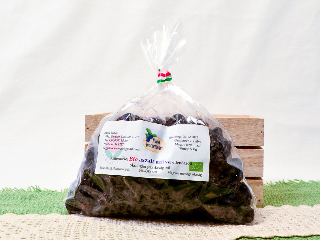 Kistermelői ellenőrött bio gazdaságban termelt bio szilvából készült kemecében aszalt szilva ( magozatlan ) aszalvány.