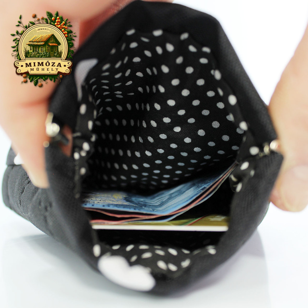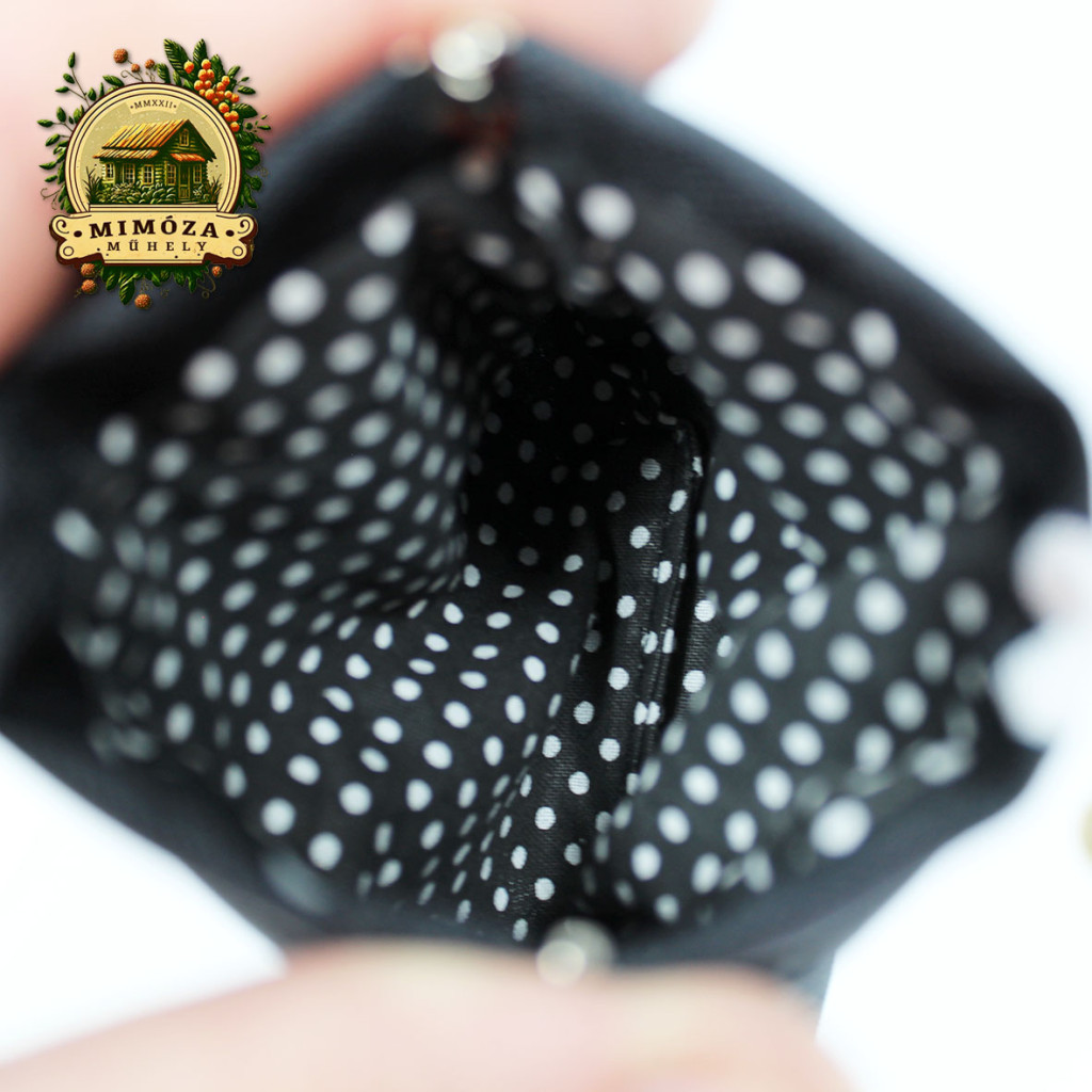 ✔ Pamutvászon bélés (fekete, fehér pöttyös) – játékos kontraszt belül