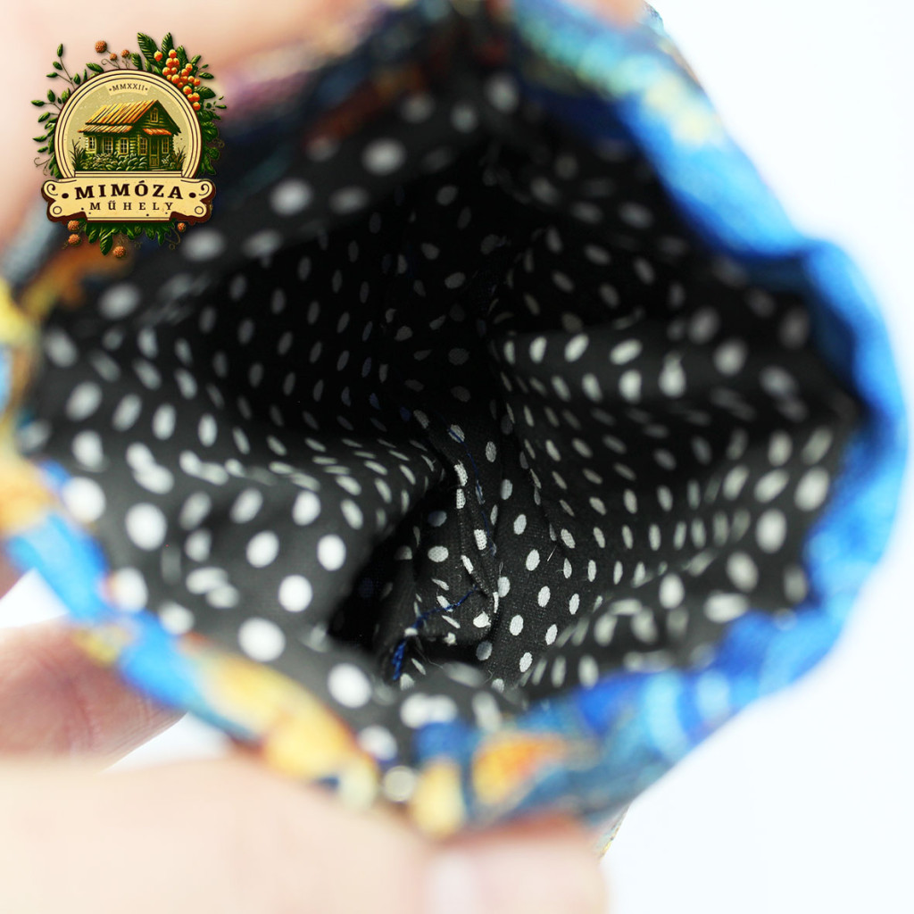 Külső rész: vízálló gyöngyvászon | Belső rész: fekete, fehér pöttyös pamutvászon | Középső: vatelin