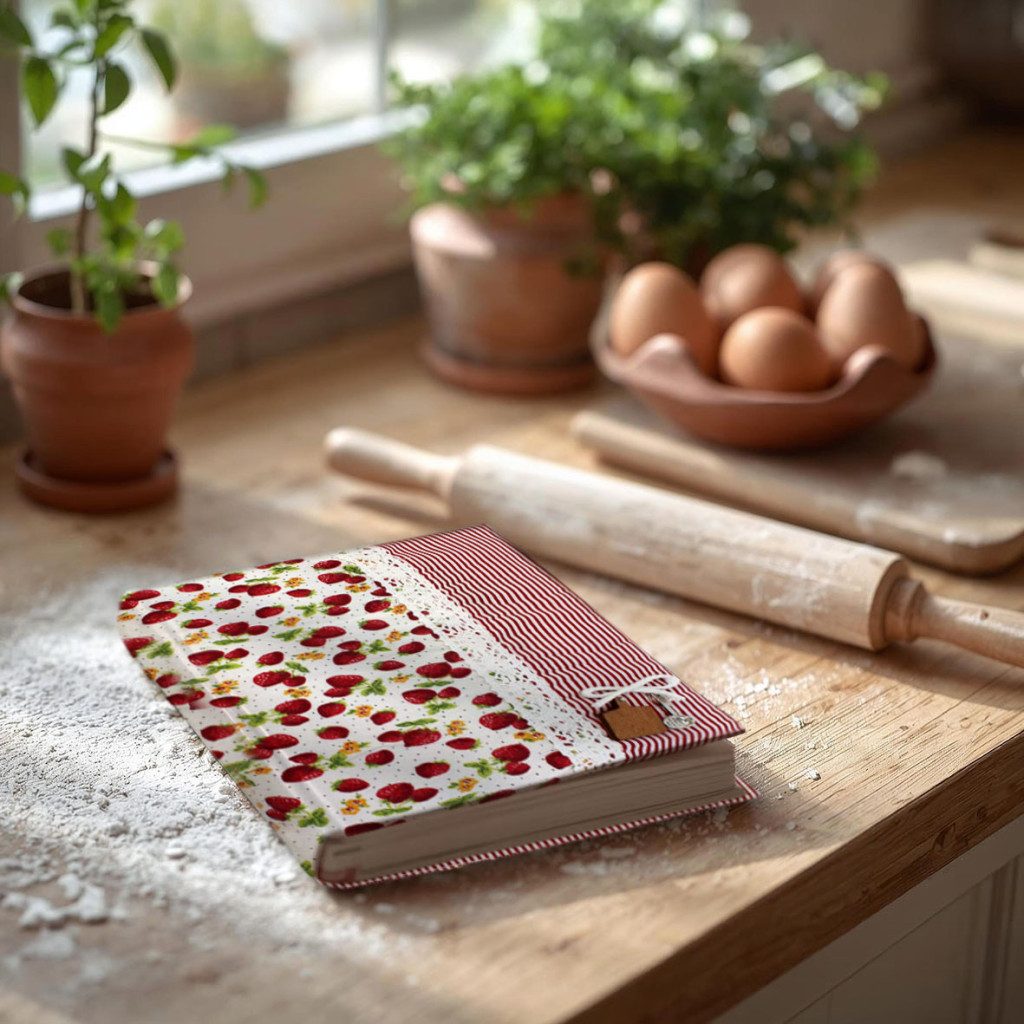 A Receptfüzet epres mintával borító nemcsak megvédi a saját receptes könyvedet a konyhai szennyeződésektől, hanem stílust és meghitt hangulatot is varázsol a konyhádba.