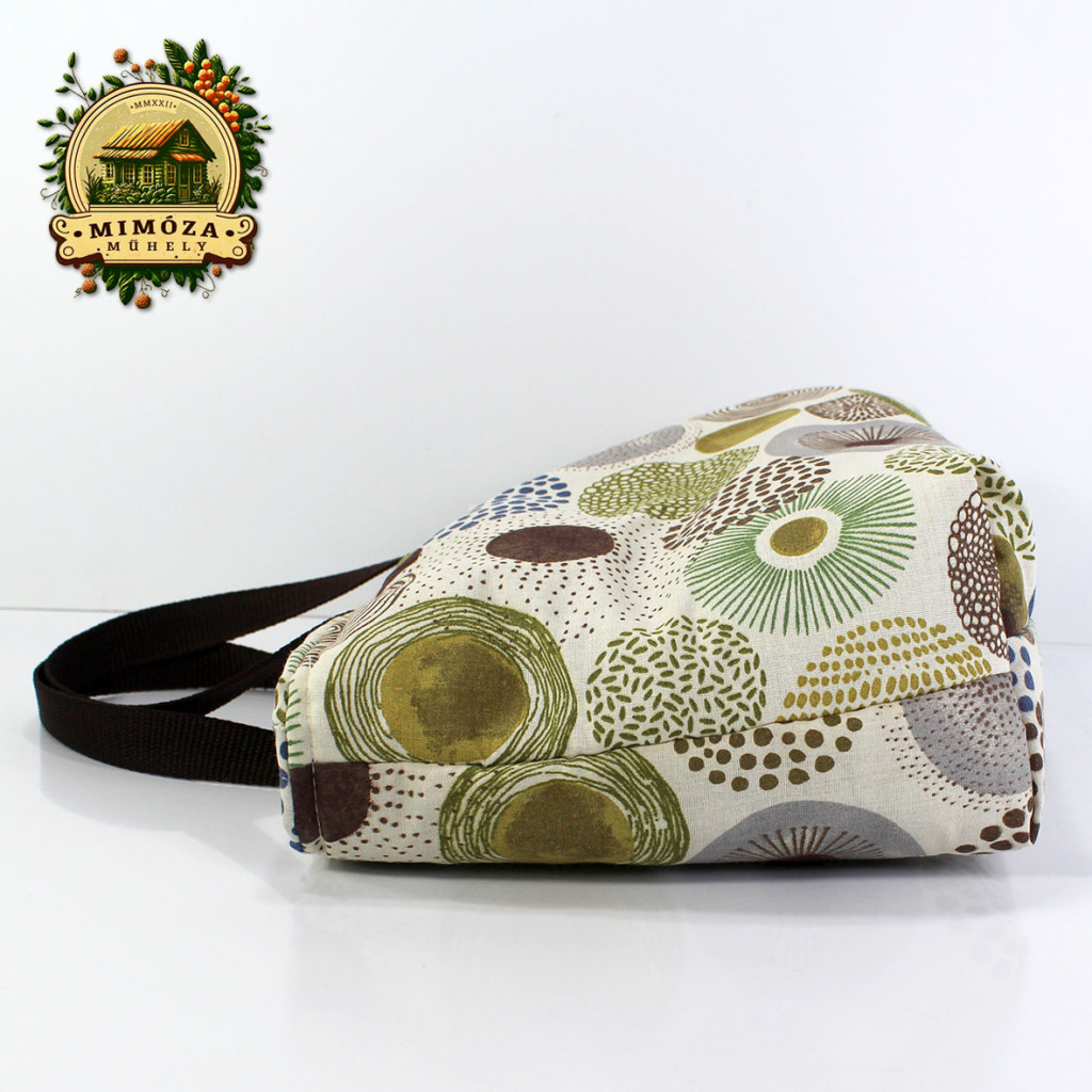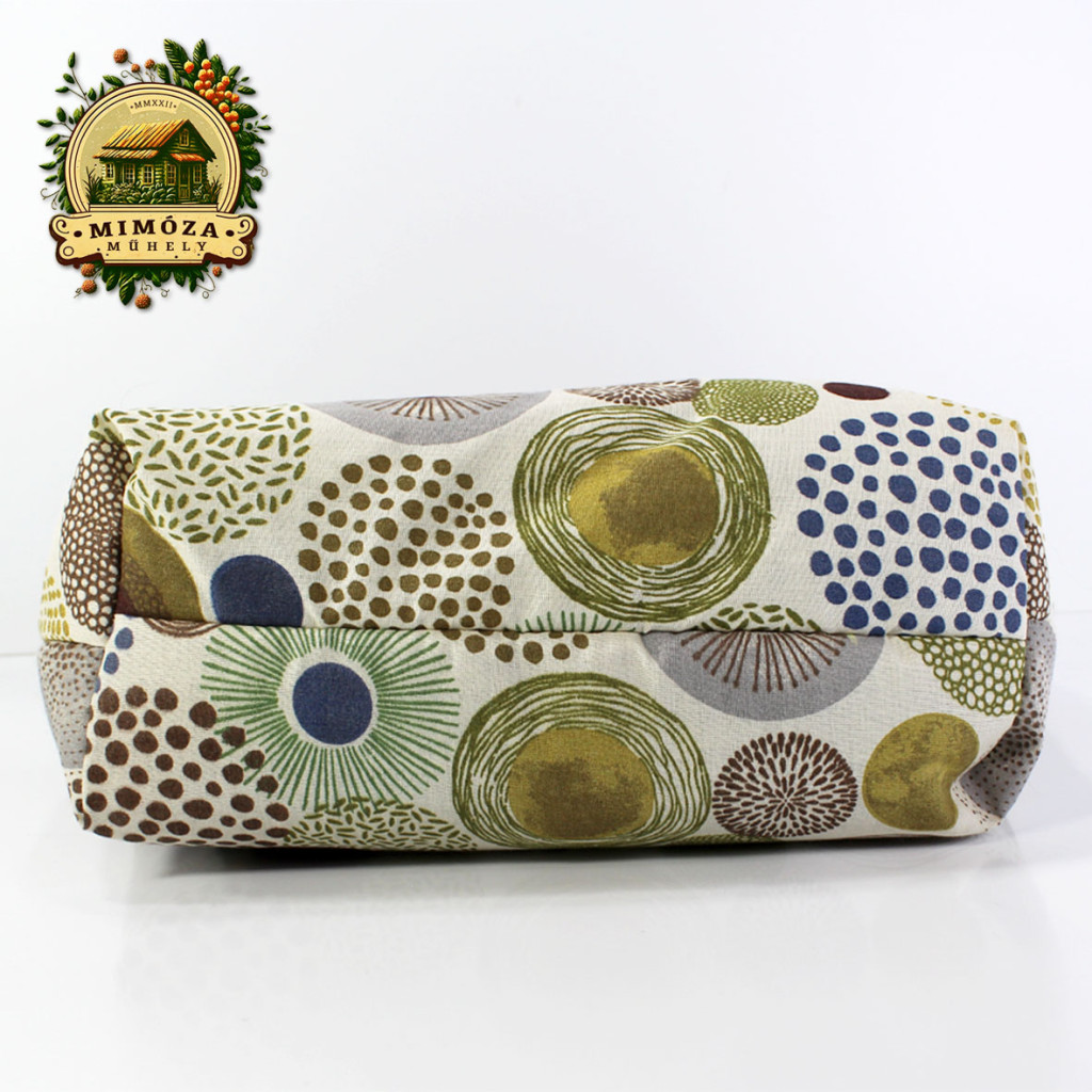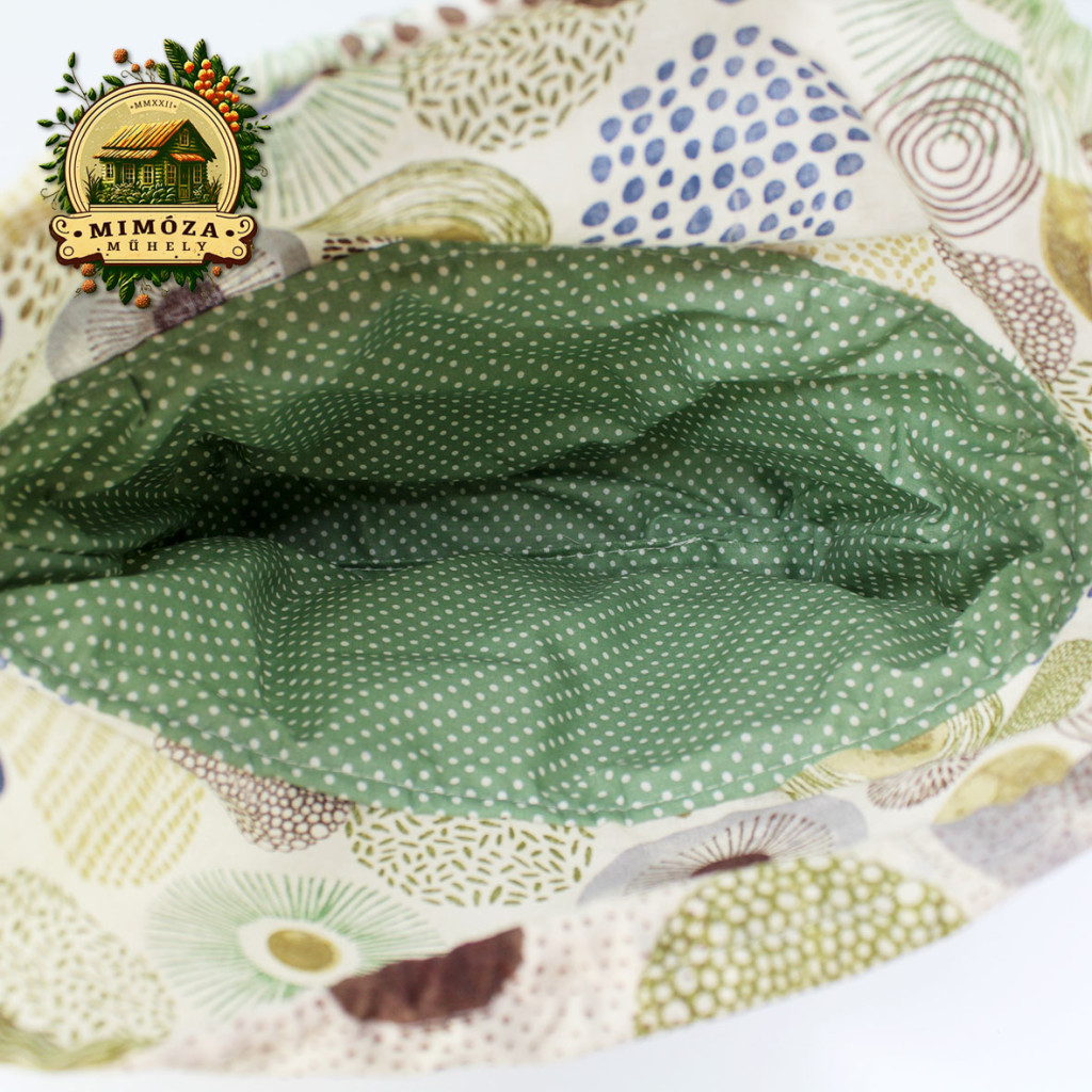 Külső rész: mintás pamutvászon | Belső rész: halványzöld pamutvászon fehér pöttyökkel | Középső rész: vatelin | Pánt: polipropilén