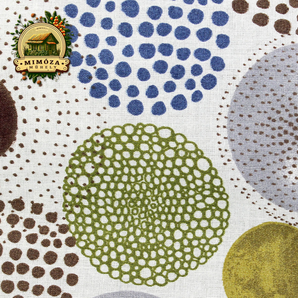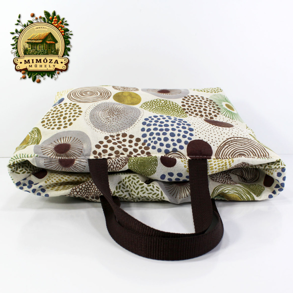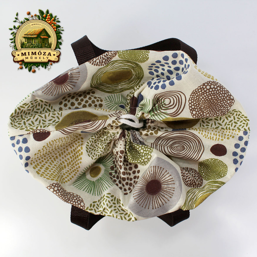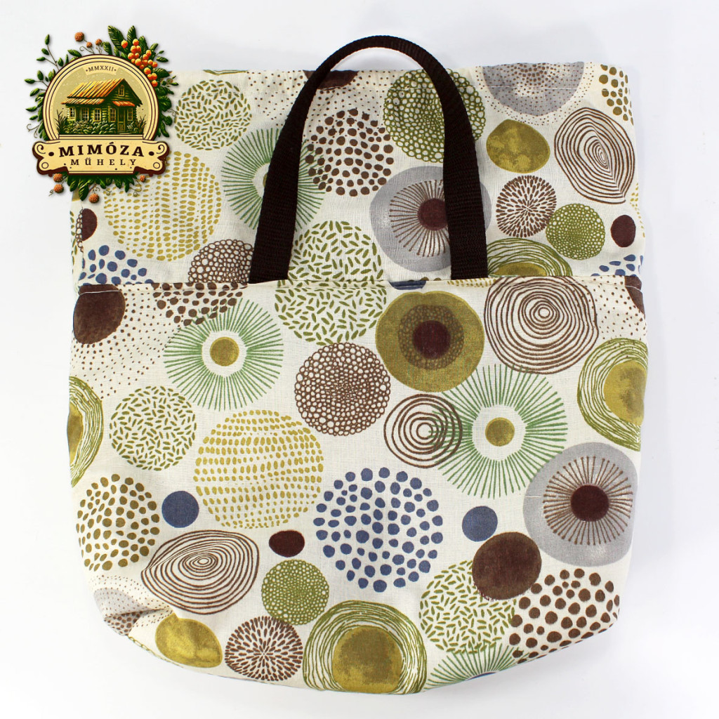 Külső rész: mintás pamutvászon | Belső rész: halványzöld pamutvászon fehér pöttyökkel | Középső rész: vatelin | Pánt: polipropilén