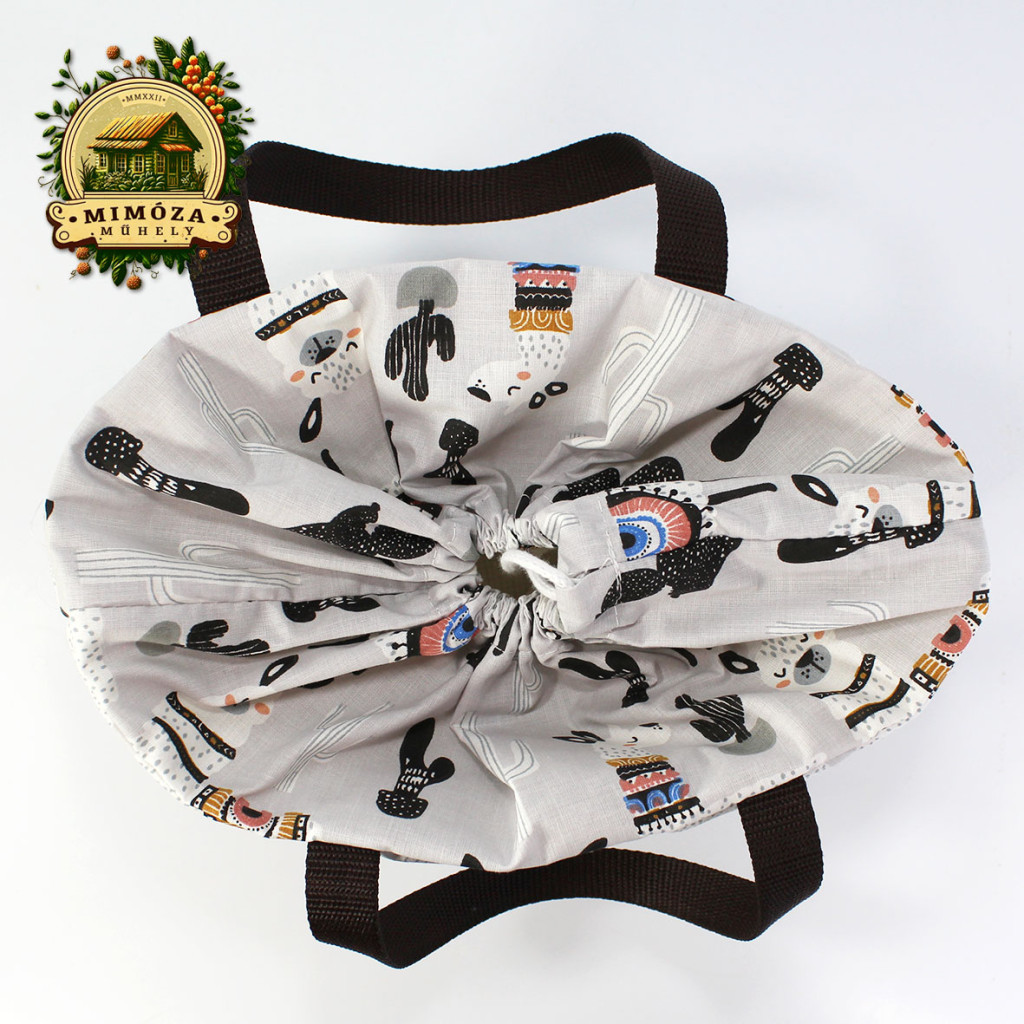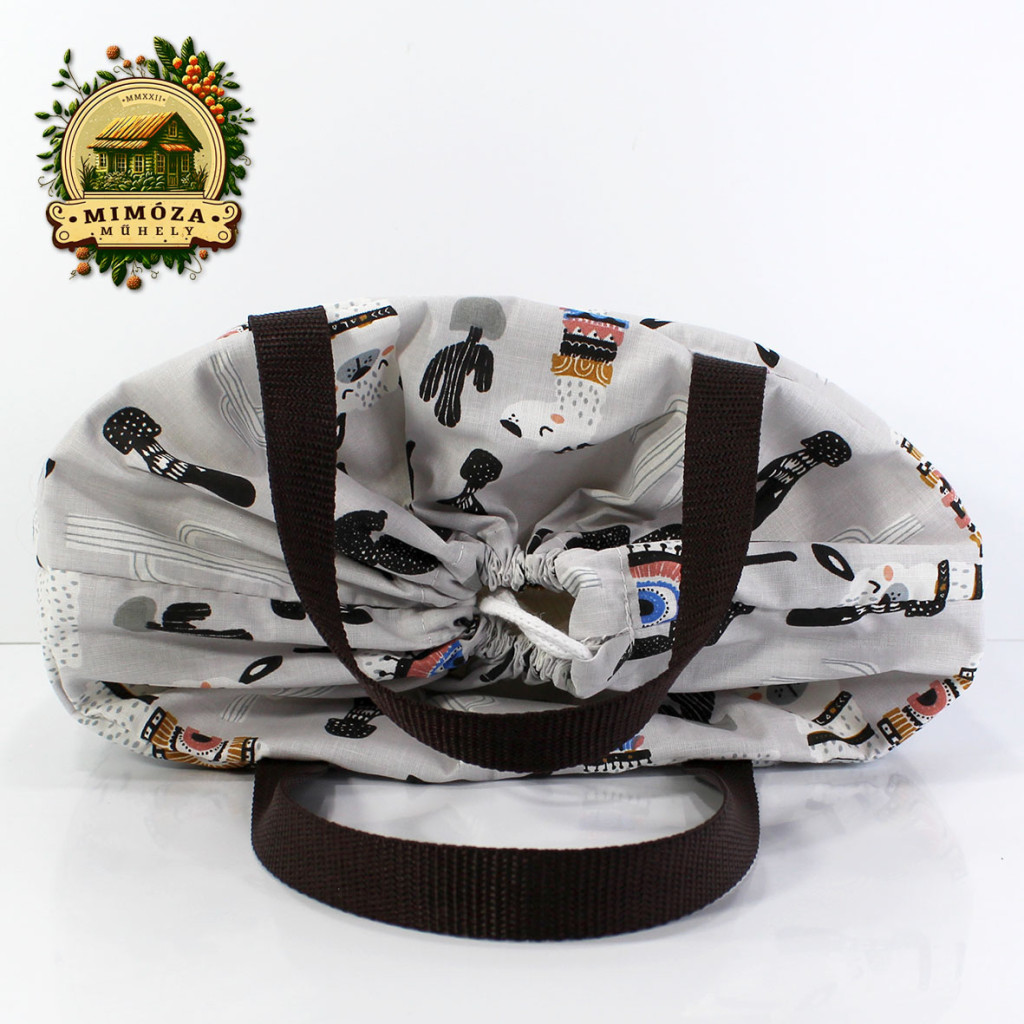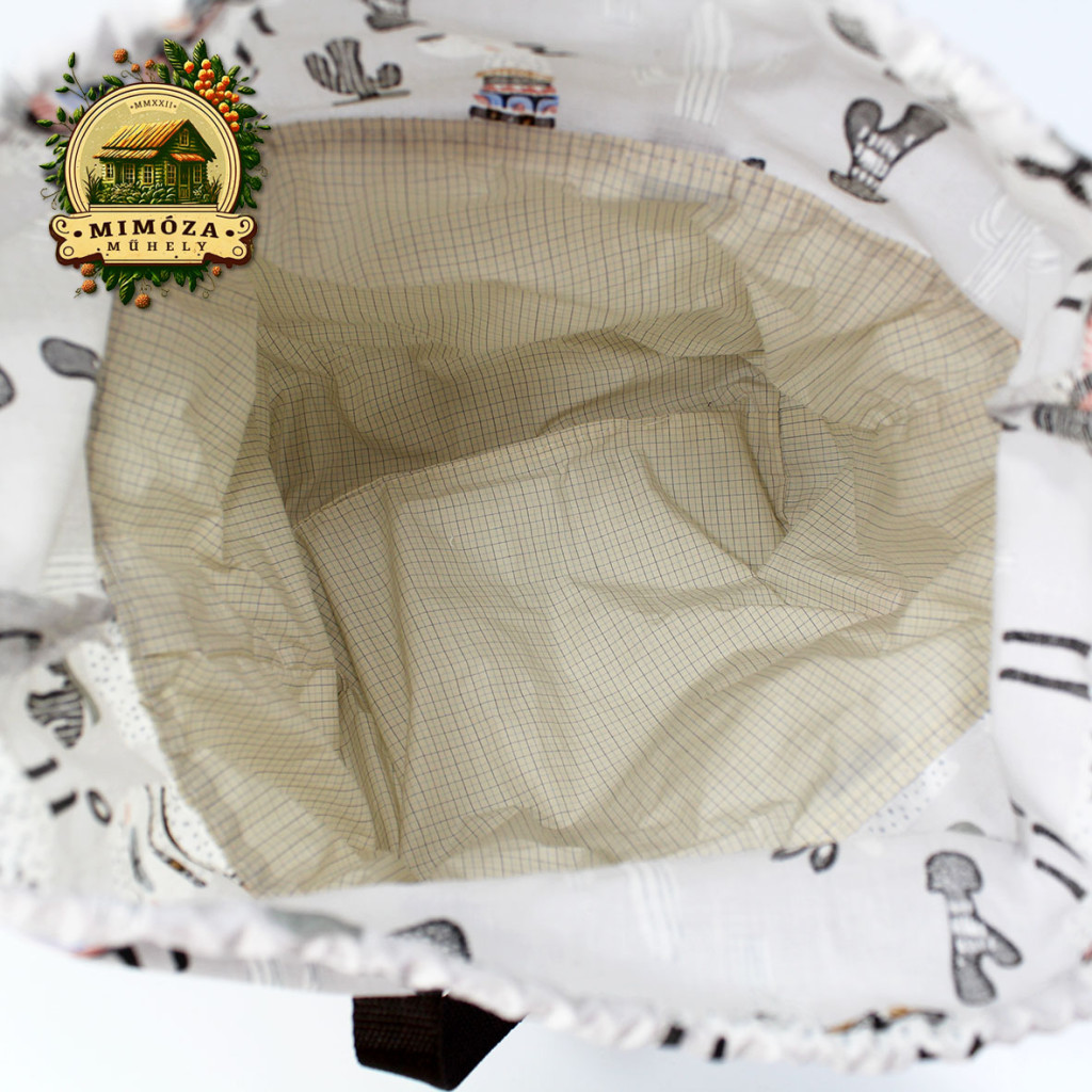 Külső rész: mintás pamutvászon | Belső rész: kockás pamutvászon bélés | Középső rész: vatelin | Pánt: polipropilén