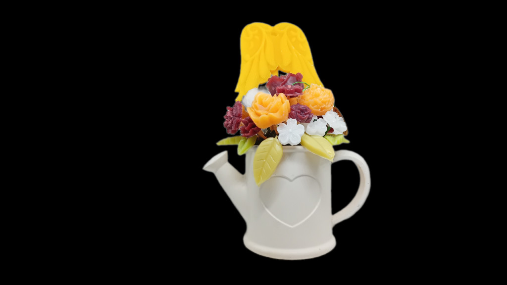 Gyertya virágbox  locsolóban A locsoló Jesmonite ásványporból készült. A Jesmonite ásványi por egy oldószermentes,akril polimer alapu rendszer része,mely vizbázisú akril folyadékkal keverve szilárd, UV-álló , környezetbarát és kiváló tulajdonságokkal rendelkező anyagot eredményez.  Tartós, könnyű és nem mérgező. Ideális  öntési és  laminálási munkákhoz, beltéri és kültéri használatra egyaránt. A virágcsokor készítéséhez felhasznált anyagok: bordó , narancssárga és fehér szinü, viaszból készült virágok ,levelek, tartósított moha,tűzőhab, A tömörítést apró fehér , mesterséges gypsophiliával oldottam meg . Szépségét sokáig élvezhetjük, nem hervad el. Szeretettel ajánlom ajándéknak,vagy saját magunknak.