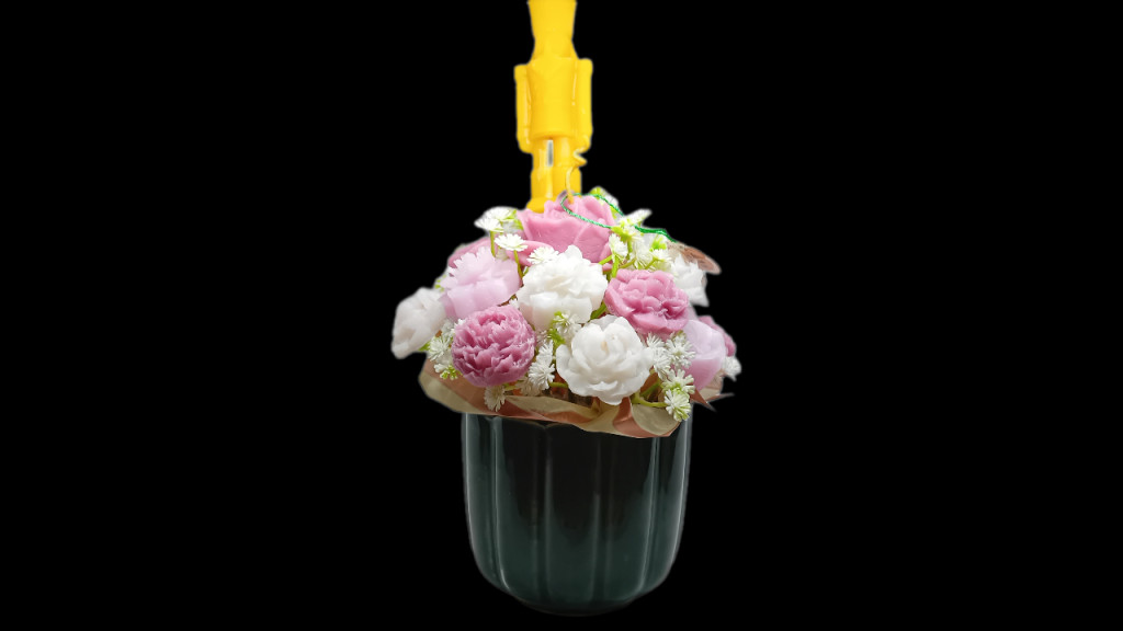 Gyertya virágbox , zöld kaspóban ,rózsaszinű és fehér virágokkal. A rózsacsokor készítéséhez felhasznált anyagok:világos rózsaszinű, közép rózsaszinű és fehér viaszból készült virágok, tűzőhab,virágcsomagoló papir, zöld kerámia kaspó. 15-16db virágot tartalmaz. A tömörítést,apró fehér, mesterséges gypsphiliával oldottam meg. Szépségét sokáig élvezhetjük , nem hervad el. Szeretettel ajánlom ajándéknak,vagy saját magunknak . Köszönöm